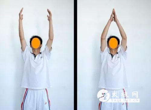 两脚开立与肩同宽,双臂高举过头,双手指朝上在头顶百会穴上方击掌,手指向上(高血压者在头前击掌)。然后双手缓慢分开,注意两臂分开距离不得超过肩宽,击掌同时顶胯。劳宫相对,共拍打36次。