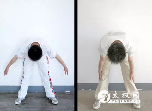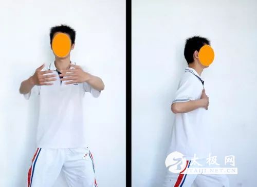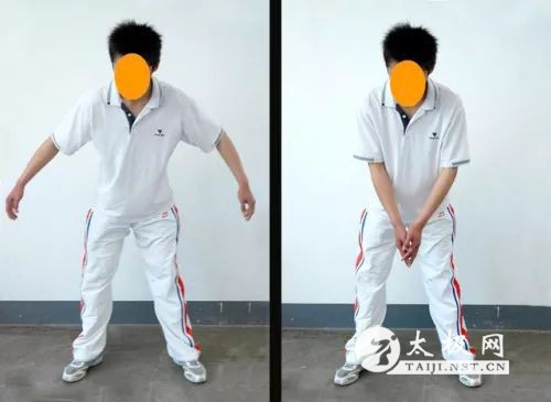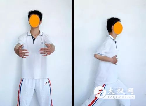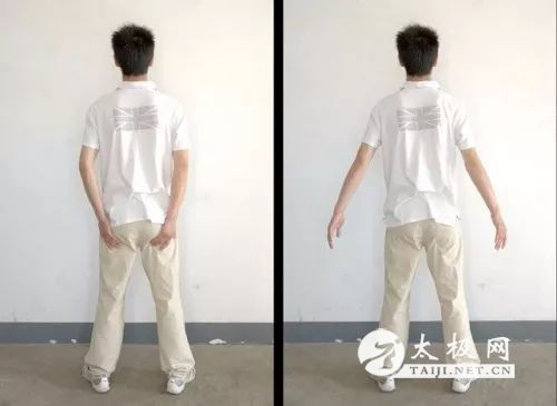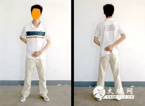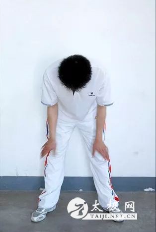 两脚平行站立,与肩同宽。开始时可念诵词句以增强信心。如:“我练太极,百病全无,拍打全身,全身舒服”。然后深呼吸,以放松全身。