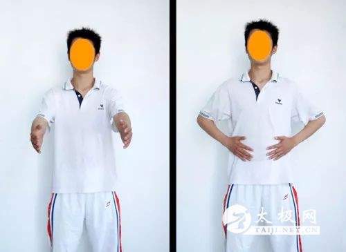 身体直立,手掌向下,用力拍打下腹肚脐两侧的天枢穴。拍打时吸气鼓腹,收式时呼气收腹。劳宫相对,重复拍打36次。