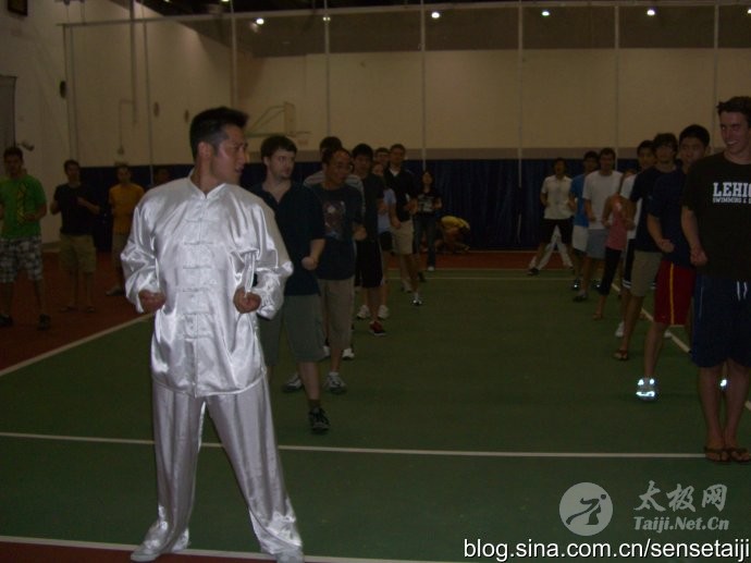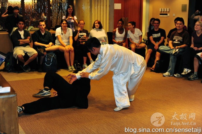 上图:申小建为美国大学生演示太极拳的技击功夫
