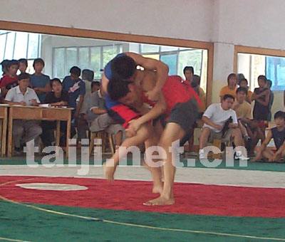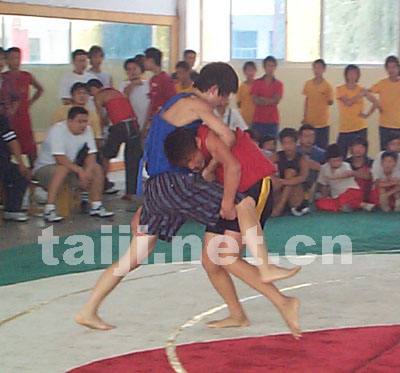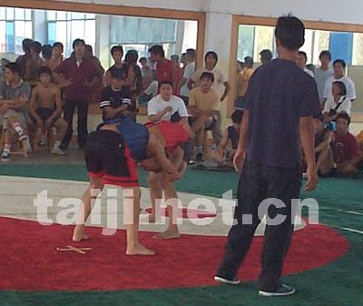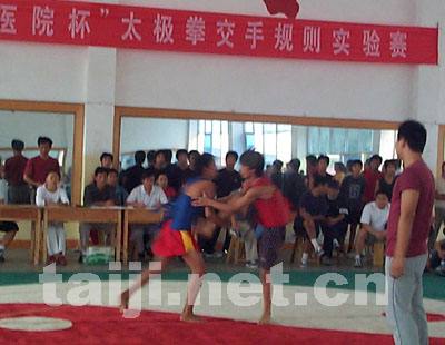 由温县体育局组织主办的温县太极交手规则实验赛今天在陈家沟武术院举行,来自温县各武校、民间团体的50多名太极选手参加了此次比赛。本次比赛旨在探讨新的太极交手规则,在比赛中进行实践,逐步完善。使比赛更能体现太极散手特色。新规则规定:三局两胜制,每局2分钟。第一局允许用腿踢、掌打。除头部、裆部禁打外,其它部位均可击打,但是踢腿击中有效部位必须是胯部以上,否则为犯规。腿踢中对方必须使对方失去平衡才能得1分,倒地3分另算。第二、三局不许用腿,但是可以运用抱腿摔,不许用拳头击打对方 ,但是可以用掌。目前该规则正在实验之中,温县体育局领导也希望广大太极拳爱好者能提出更好的建议,使新规则更加完善,让太极散手真正走上擂台。