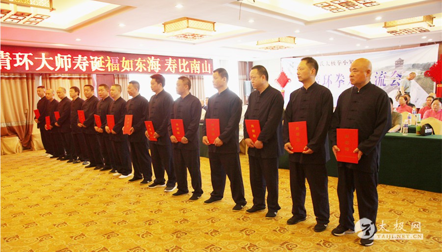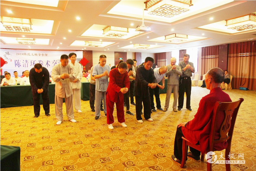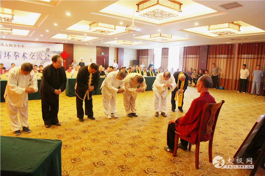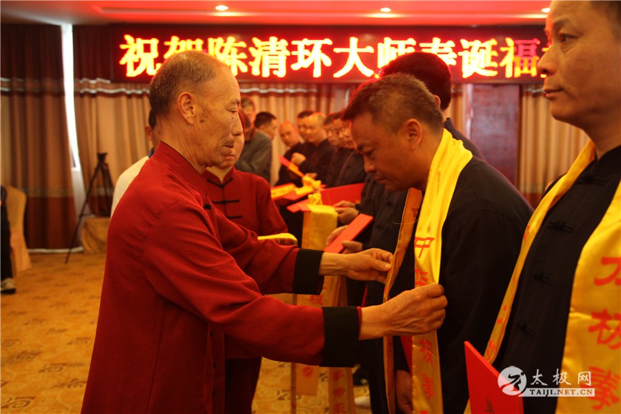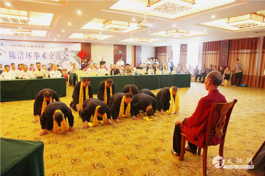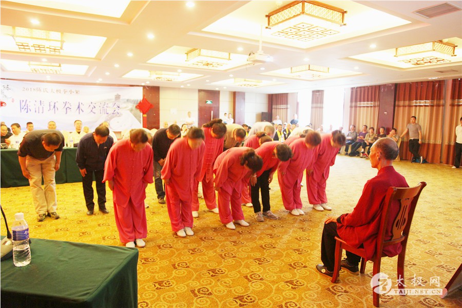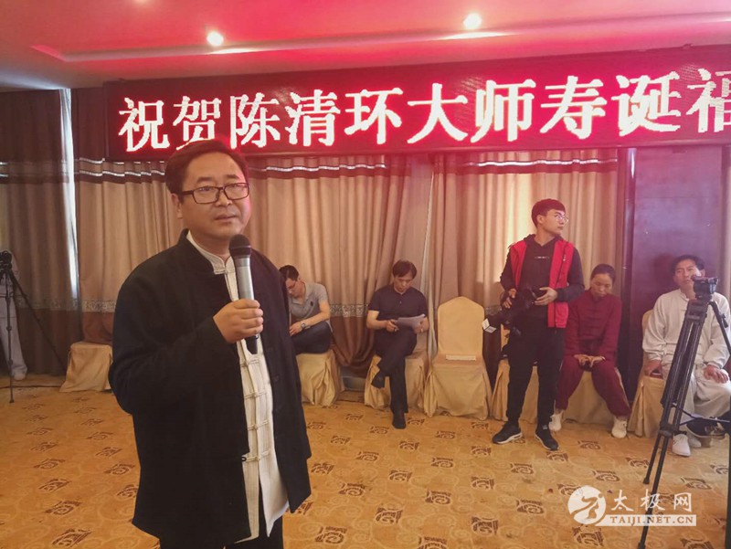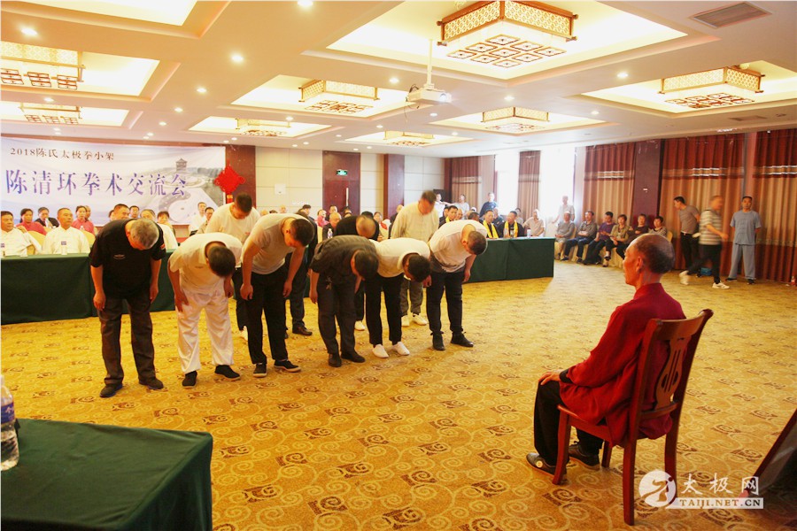 (太极网报道)2018年5月1日,陈家沟陈氏第十九世、陈氏太极拳小架第十代传人、陈氏太极拳小架研究会会长陈清环72岁寿诞庆典暨收徒仪式于太极拳发源地温县陈家沟举行。来自全国各地的陈清环弟子传人及学员齐聚陈家沟庆贺并交流。 晨练 温县政协副主席严双军,太极网创始人、温县太极拳传承人联合会主席刘洪奇等出席活动,从湖北浠水、江苏徐州、界首、焦作博爱、修武、洛阳市吉利区、合肥、汕头、济宁、周口等地的陈清环老师的弟子及众多亲朋好友欢聚一堂,共庆陈清环大师寿诞。活动由陈家沟陈氏家族理事会秘书长陈石岩主持。 现场领导及嘉宾 活动现场 严双军讲话 陈石岩 活动开始前,全体人员集体向太极拳始祖及历代宗师鞠躬行礼。陈清环老师长侄贝特加机械铸造有限公司董事长陈天聪致辞。随后,陈清环大师收徒仪式正式开始。本次有干得民、陈志、郭卫明、汪洋、闫瑞卿、袁新年、王联合、邓学军、胡绪志、于徳、熊革林、崔同卫、李文权、宋国杰、李向征等15名优秀的太极拳爱好者拜入陈清环大师门下,成为陈氏太极拳小架第十一代传承人,承担起传承太极拳,弘扬太极文化的历史重任。 陈清环大师敬香行礼 陈天聪致辞 陈清环老师向太极拳始祖陈王廷及历代宗师敬香行礼,先祖创拳之辛劳,追思先师传拳之恩德。随后,新入门第依次上前递交拜师贴、行拜师礼、敬拜师茶,师父回礼。陈清环老师向新入门弟子训话,他希望新入门的弟子们能够恪守门规祖训,认真习练太极拳,用心体悟太极文化,为早日成为合格的太极拳