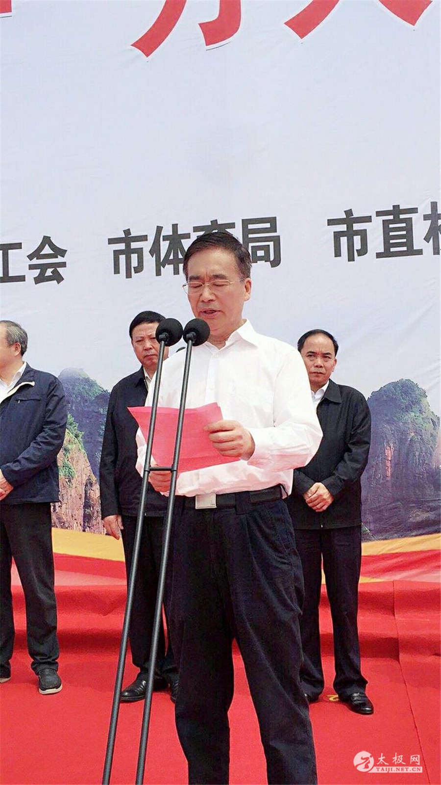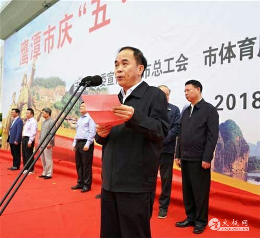 鹰潭市委书记郭安同志宣布一鹰潭市庆“五·一”万人太极拳展演活动开始