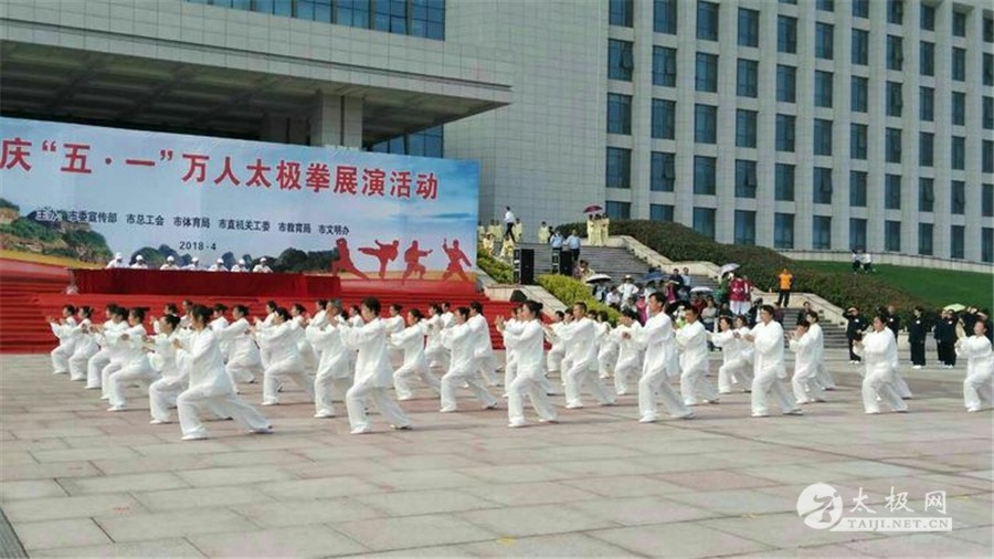 (太极网报道)2018年4月27日上午,鹰潭市庆“五·一”万人太极拳展演活动在市经济大厦南门广场隆重举行!展演活动由鹰潭市总工会具体组织策划、各级工会组队参加,全市100多个单位参与,主会场4000余名职工群众现场展演,场面壮观震撼!首次采用无人机航拍直播,聚集了多家主流媒体,营造了浓厚的道都氛围!
