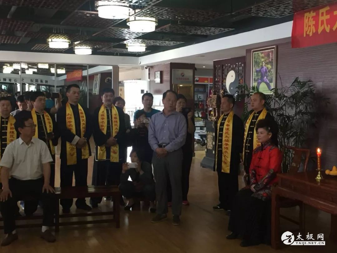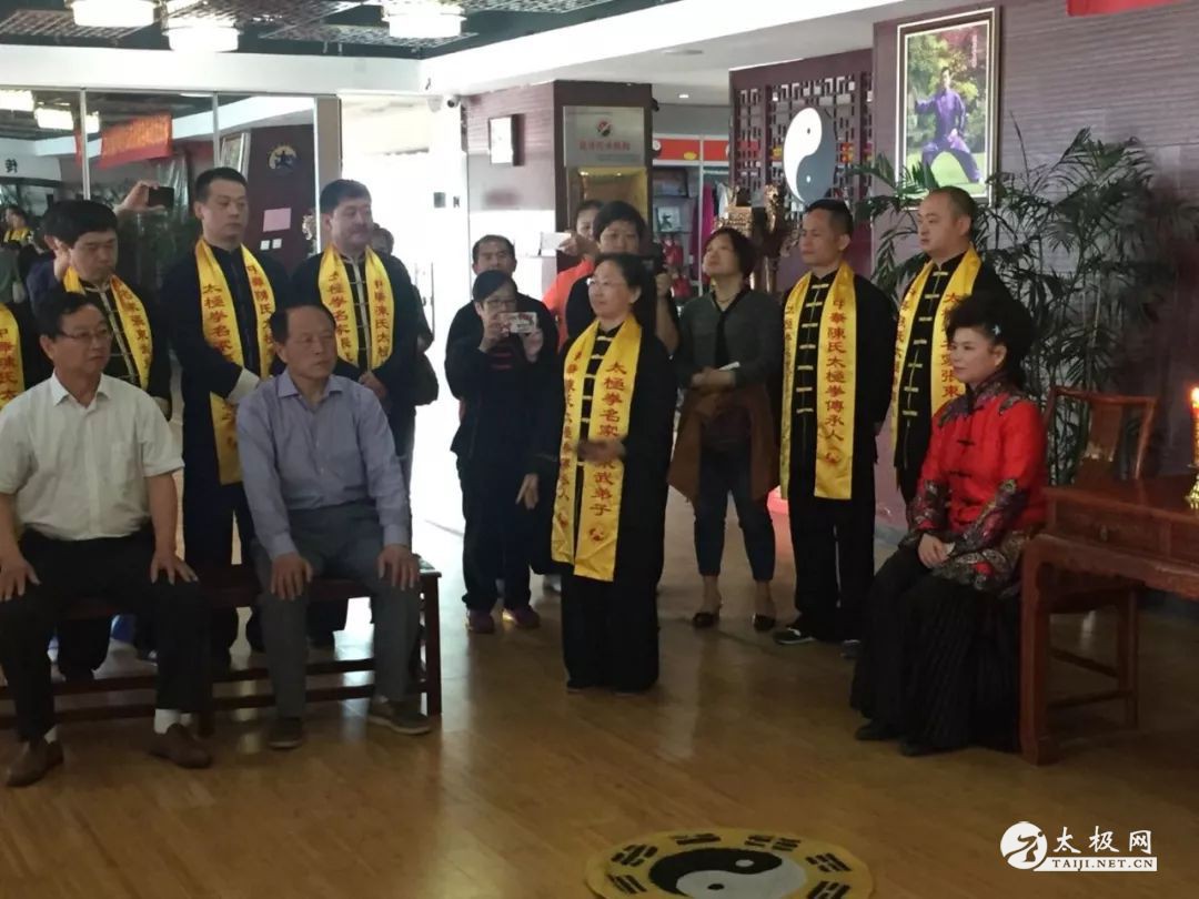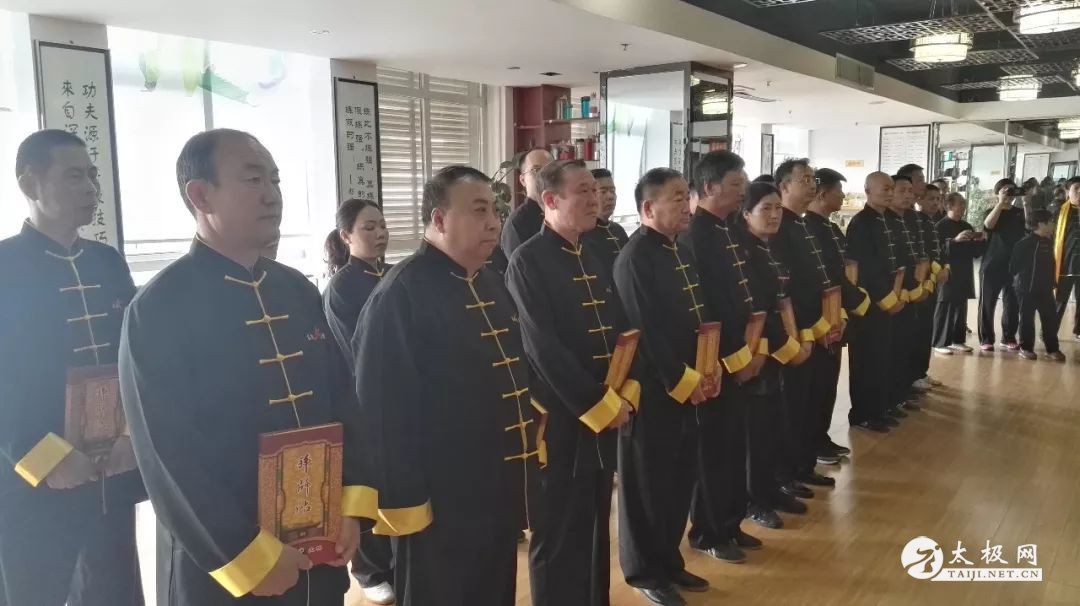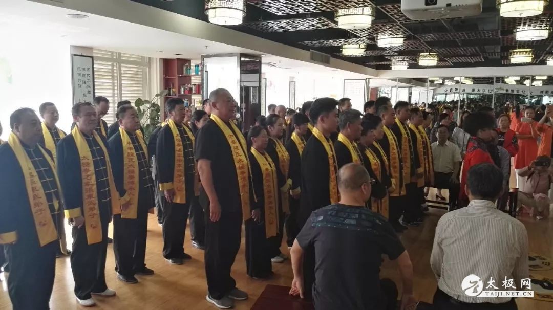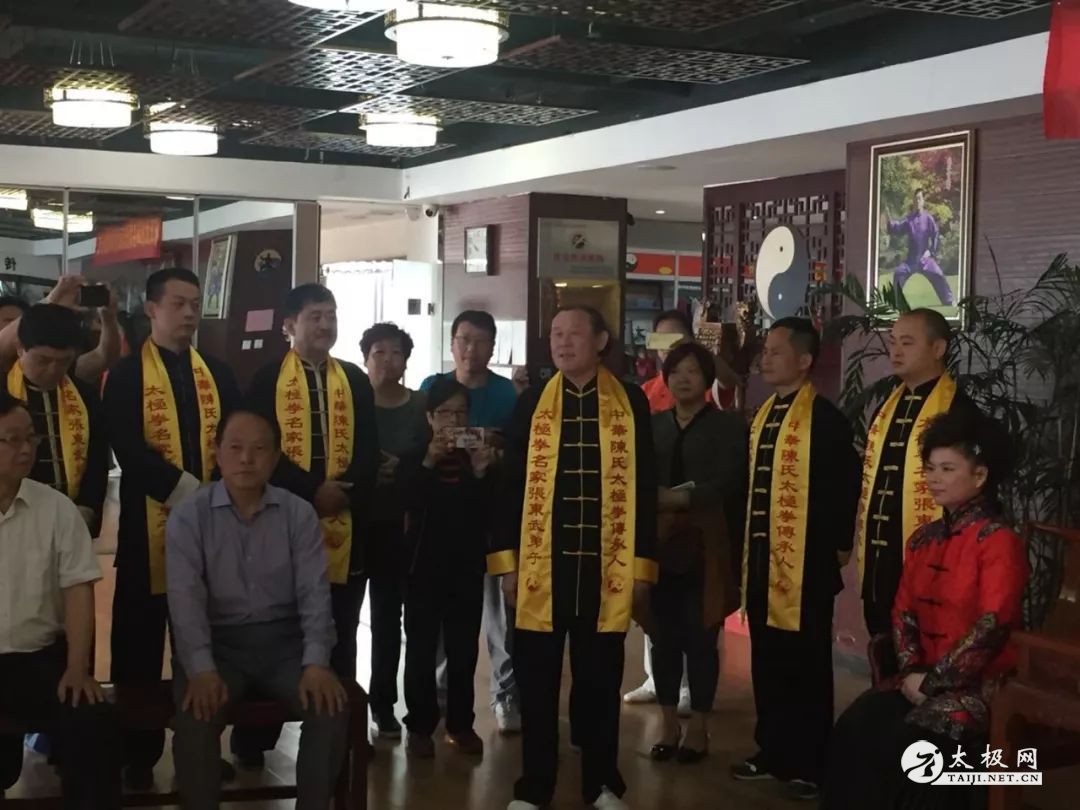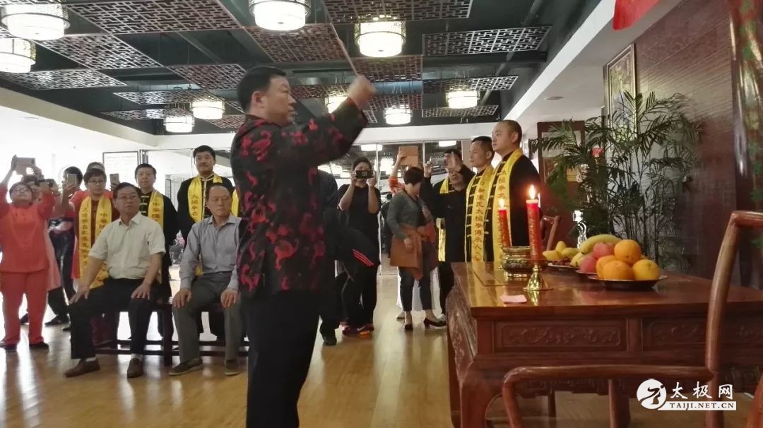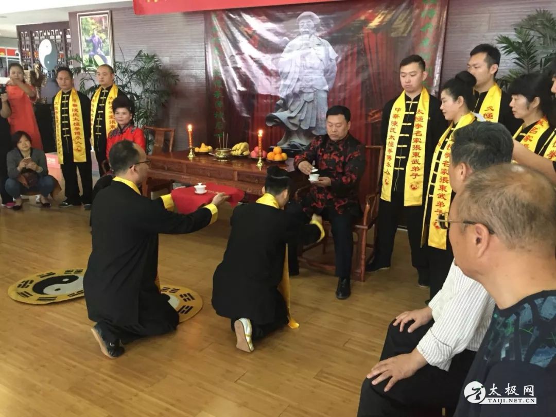 参加拜师仪式的嘉宾有:郑州市人民政府台湾事务办公室处长乔保昌、中铁七局郑徐枢纽指挥部党工会书记陈喜庆、郑州市老年人体育协会副主席王源海、河南省著名企业家马杰。 新老弟子站立在祖师像前,身着传统服装,场面庄重而热烈。上午十时许拜师仪式准时开始,主持人李滨宣布拜师仪式开始,老弟子分列会场两侧,新弟子列队面向祖师而立,四名护法弟子太师椅俩测站立。 世间百行,无祖不立。太极神功,创自廷公。传数百载,流布五洲。陈式太极,嫡传正宗。东武弟子,一脉相承。张东武老师携夫人徐勤兰老师向祖师陈王廷焚香叩拜,拜师仪式正式开始,师兄李卫波带领众新弟子拜师宣誓,拜师弟子跪拜先师并依次向师父行礼递交拜师帖,张东武老师为弟子披挂绶带,场面庄重肃穆。最后新弟子代表雷小华、谷利明给师父、师母敬茶礼成,宣示陈式太极第十三代传人又添新丁。 入门宣誓