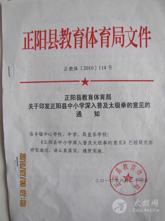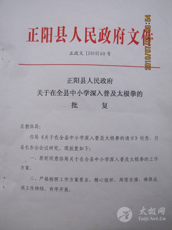 王大春太极山庄一声“礼炮”的轰鸣,使豫南驻马店正阳县绽开了一片片五彩缤纷的彩花。自去年王大春在家乡正阳县建起太极山庄,以此为基地,掀起了太极拳普及的狂澜。继县直各单位太极拳热潮初起,正阳县教育系统出台了县政府批准的红头文件,将太极拳纳入了全县中小学的教学课时计划和中招体育考试的单列项目。把《中共中央、国务院关于加强青少年体质的意见》的精神以时尚的形式往实处落实。这将成为正阳县教育的特色品牌。