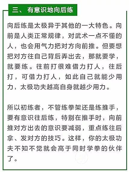 好了,下面就把提高练拳效能的三大要领简要介绍如下: 一、 不贪多,不求快 用耐心打好太极的根基。大家知道,练外家拳都很重视基本功。因为外家拳大部分由多种基本功组成。但练太极的往往对基本功草草一过就开始套路学习,套路未完练推手,推手刚会学散手。有些师傅,也一味迎合学员的想法,上来就教套路,以至于学员的套路因基本功不扎实导致大量问题,为以后的改拳带来极大麻烦。 精明的学者,以质量为起点,重内不重外,重正确不重数量,重要点不重速成,上式没掌握不练下式,套路未达到要领不学器械。一位太极宗师曾说过,如果你的太极练对了,每天练个十几分钟也很长功夫,倘若练得不对,练得时间很长也是不得要领,始终进不了太极的门槛。