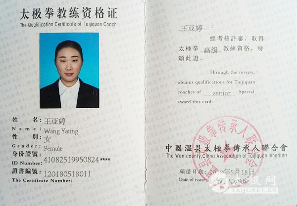 王亚婷,河南温县人,陈式太极拳第十二代二十世嫡系传人,太极拳高级教练,国家武术一级裁判员。自幼随其父王永和长辈习练太极拳。从七岁学拳至今,跟随朱天才,王西安大师,吸取百家之长,融会贯通。拳术具有迅、猛、灵、脆、圆、顺的特点。演练套路似行云流水,连绵起伏,舒展大方,形神兼备。中国陈家沟邀请赛获得女子陈式太极拳小架一等奖,女子太极剑一等奖,并获得“优秀运动员”称号。央视武林大会走进陈家沟套路比赛获得女子丙丁组陈式竞赛套路一等奖,太极双刀一等奖。河南省青少年传统武术锦标赛获得女子太极类双锏第一名,并获得“体育道德风尚奖”为年轻一代太极拳师的佼佼者。 |