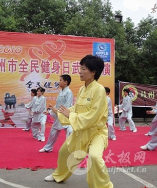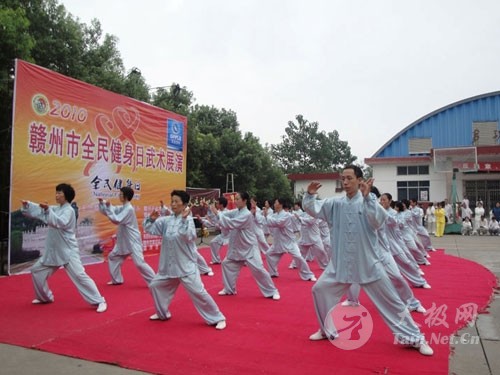 8月6日上午,江西赣州市举行全民健身日武术展演,迎接8月8日我国全民健身日。赣州永萍太极养生俱乐部的30多名成员和市铁路俱乐部、老年协会、市区各晨练队、市区各太极协会组织,武术馆等共十多个组织的上千名武术爱好者,参加了这次由赣州市体育局、市武术协会主办的这次活动。 这次他们参演的项目是:太极拳缠丝桩 和陈式太极拳老架一路。在吴永萍的带领下,会员们飘逸舒展的拳姿和深含文化内涵的解说,令当地广大武术爱好者对太极拳的理解耳目一新,赢得了一阵阵热烈的掌声。他们的表演,引起了赣州晚报、电视台等当地新闻媒体的注意,并作了相关报道。 赣州永萍太极养生俱乐部是由太极拳名师吴永萍组织成立的。成立以来,他们以认真规范的教学方式、温馨活泼的活动氛围以及形式多样的活动方法,吸引了广大太极拳爱好者。他们通过业余辅导、开办网站、拳理讲座等形式,向广大拳友传授太极拳文化、交流学习太极拳的体会、进行陈式、杨式太极拳传统和竞赛套路及各种器械的辅导,是赣州地区一支活跃的民间太极拳组织。作为俱乐部负责人,吴永萍经常受到内蒙、山东 、湖北、福建、湖南、广东、黑龙江、吉林、北京、上海以及德国、意大利、印尼等国太极组织及“太极拳迷”的邀请,在国内外进行太极拳文化的传授。这位由安远县走出,打开当地太极拳世界性交流之门的太极拳师,以其精湛的技艺、明晰精辟的讲解方式和启人领悟的辅导方法,所到之处,遍受欢迎,被誉为大山里飞出的“太极灵凤”。