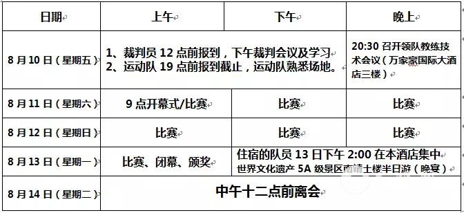 赛事流程 一、主办单位: 福建社会体育指导中心 福建省武术协会 南靖县人民政府 二、承办单位: 漳州市武术协会 南靖县文化广电体育局 惠安县崇武古城武术馆 三、赛事时间、地 点: 时间:2018年8月11日—8月13日 地点:南靖县体育馆 四、赛事项目 (一)南拳类、其他拳术类、太极拳类的拳术、器械单练套路 (二)南拳类、其他拳术类、太极拳类的徒手、器械对练套路 (三)南拳类、其他拳术类、太极拳类、健身气功类的集体项目 五、参加单位 海内外武术团体、馆校,大专院校、俱乐部及个人均可报名参赛。 六、参赛办法 (一)每队可报领队1人,教练2—3人,队医1名,运动员(男女)人数不限。 (二)单练项目:每名运动员只能代表1个运动队参赛,最多报5个单项(同一流派拳种的拳术、器械不得同时报2项)),可兼报对练和集体项目。 (三)对练项目:每名运动员最多报2项(拳术、器材)对练项目,不得跨队当陪练。对练不分年龄,可男女混编。 (四)集体项目:每队限报集体项目2项(拳术、器材),人数6—12人,少于6人不予编排,性别、年龄不限。 (五)个人全能:运动员参加个人全能:南拳类、其他拳术类的单练套路须报拳术、短器械、长器械三项;太极拳类须报1项拳术、2项不同太极器械。个人全能项目不包括对练。 (六)团体赛:各代表队参加团体赛:参赛运动员不少于25人(含25人),并需要参加集体项目(健身气功除外)。团体赛不设年龄、男女组。 七、竞赛办法 (一)本次比赛为个人单项赛、个人全能赛、集体项目赛、团体赛。 (二)竞赛规则: 1、武术套路按中国武术协会2012年印制的《传统武术套路竞赛规则》及本次大赛有关补充规定执行。 2、健身功法集体项目按中国健身气功协会2009年印制的《健身气功竞赛规则》及本次大赛有关补充规定执行。 (三)项目时间: 1、传统拳术、器械不超过2分钟(太极类项目除外)。 2、规定和自选拳术、器械不少于1分20秒(太极类项目除外)。 3、太极拳不超过4分钟。演练至3分钟时,裁判长鸣哨提示。 4、太极器械不超过3分钟。演练至2分钟时,裁判长鸣哨提示。 5、太极拳和太极器械竞赛套路减少动作不予扣分。 6、对练项目不少于40秒。太极拳对练不超过3分种。 7、武术类集体项目不超过4分钟,须配乐(自备CD光盘),音乐伴奏中不能出现说唱等内容,若出现说唱裁判长总扣0.1分,未配乐者裁判长总扣0.1分。比赛中由本队教练或领队负责播放音乐。 8、健身气功集体项目不超过6分钟,须配乐(自备CD光盘),比赛中由本队教练或领队负责播放音乐。运动员在比赛时,必须穿民族传统形式的服装、武术鞋或健身鞋。 (四)年龄分组: 儿童组(A组): A组:10岁以下(含10岁,2008年以后出生); 少年组(B组): B1组:11~15岁(2007年至2003年) B2组:16~20岁(2002年至1998年) 青年组(C组): C1组:21~30岁(1997年至1988年) C2组:31~40岁(1987年至1978年) 壮年组(D组): D组:41~50岁(1977年至1968年) 中年组(E组): E组:51~60岁(1967年至1958年) 老年组(F组): F组:61~75岁(1959年至1948年) (五)比赛服装规定: 运动员在比赛时,必须穿民族传统形式的服装、武术鞋或健身鞋。 八、录取方法与奖励办法 (一)录取方法 1、单练项目:按年龄组,男、女分别录取金奖40%、银奖30%、铜奖30%,并颁发奖状和奖牌。 2、各年龄组、各单项男、女报名参赛人数在5人(不含5人)以下时,按同类项目,男、女分别在同一年龄组别内编组录取,录取比例和办法同个人项目。凡并组后不足2人(含2人)时,将根据以下比赛成绩录取金、银、铜奖。 3、对练项目:按武术类(含南拳类和其他拳术类)、太极拳类的徒手、器械(含徒手与器械)分别录取,录取比例和办法同个人项目。 4、集体项目:(1)按武术类(含南拳类和其他拳术类)、太极拳类的拳术、器械各录取前三名,共12个奖项,颁发奖状和奖牌。(2)健身气功类按八段锦、易经筋、五禽戏、六字诀、其他健身功法各录取前三名,共15个奖项,颁发奖状、奖牌。凡报名参赛队在3队(不含3队)以下时,将编入其他健身功法组录取; 5、个人全能:按A、B、C、D、E、F年龄分组,不分拳种、流派、拳种,男、女各录取前三名,共36个奖项,并颁发奖状和牌匾。 计分方法:以拳术、短器械、长器械三项(太极拳除外)最高得分之和计算,太极拳以拳术、器械三项最高得分之处计算。总分多者名次列前,总分相等以获金奖多者列前,如仍相等,则以获得银奖多者列前,以此类推;如获得所有奖项均相等,则并列。 6、团体名次:不分拳种类别、年龄、男女,录取前三名。第一名20000元,第二名15000元,第三名10000元,并颁发获奖牌匾。 计分方法:以参赛人数达25人以上代表队的所有个人单练项目(不含对练)比赛成绩总和计算团体总分。总分多者名次列前,总分相等以获金奖多者列前,如仍相等,则以获得银奖多者列前,以此类推;如获得所有奖项均相等,则以参赛人数少者列前;若再相等,则并列。 7、在比赛期间,福建省武术协会将组织武术段位一至六段考评成绩出当场领证,考试规程请网上查看:www.nslhx.com 九、报名方法与报道 (一)报名 1、报名截止时间为2018年7月25日,报项表可网上下载或自做(网址:www.nslhx.com)。 2、各参赛队于2018年7月25日前务必将报名运动员本人1寸免冠照片、身份证复印件、安全责任声明书、于报名时一并用快递邮寄到福建省惠安县崇武五峰欢迎门对面右边大厦六楼《古城武术馆》大赛筹委会。 3、为使报名报项准确无误,竞赛部接到