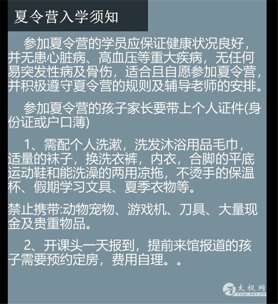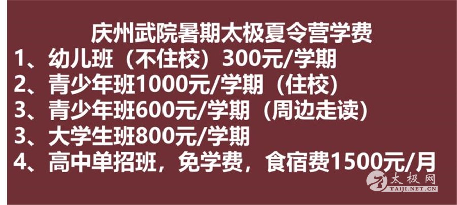 暑期将至,家长朋友们是否开始担忧,这个暑假,孩子会不会又沉迷于网吧、游戏厅,彻夜不归?或是在家睡懒觉,日夜颠倒,无所事事?又或是整日与朋友们外出,不知行踪?相信家长们都希望,孩子能有一个丰富多彩又充满意义的假期。孩子们也希望能度过一个快乐又有收获的暑假。如何让孩子有一个德艺双方面提升的机会?如何使孩子既可以开启孝心,懂得为人处事又能拥有一个强健的体魄,做一个德才兼备的人呢?温县庆州武院青少年太极夏令营的完美解決了家长朋友们的担忧、满足了孩子们的需求。 温县庆州武院为了弘扬太极拳文化,丰富广大青少年暑假生活,拓展兴趣、磨练意志,提高将来适应社会的能力。即将开办“青少年太极夏令营”。温县庆州武院青少年太极夏令营活动内容丰富、活动多多包括:传授传统陈氏太极系列拳械套路、武术基本功、武术礼仪,专业文化课补习,真人CS拓展活动,趣味娱乐活动等。时间:7月6日至8月15日,每周日休息一天。 |