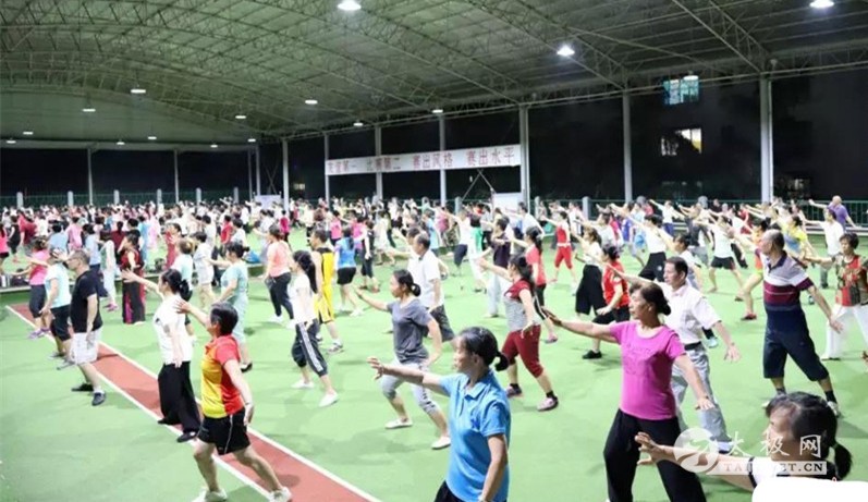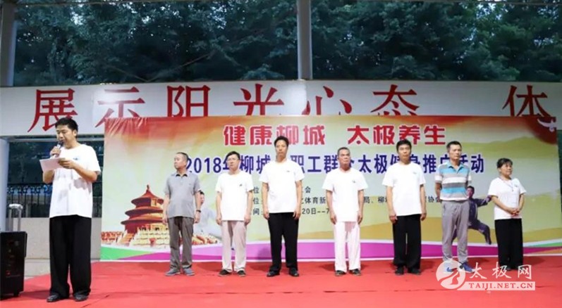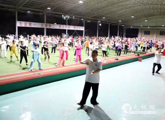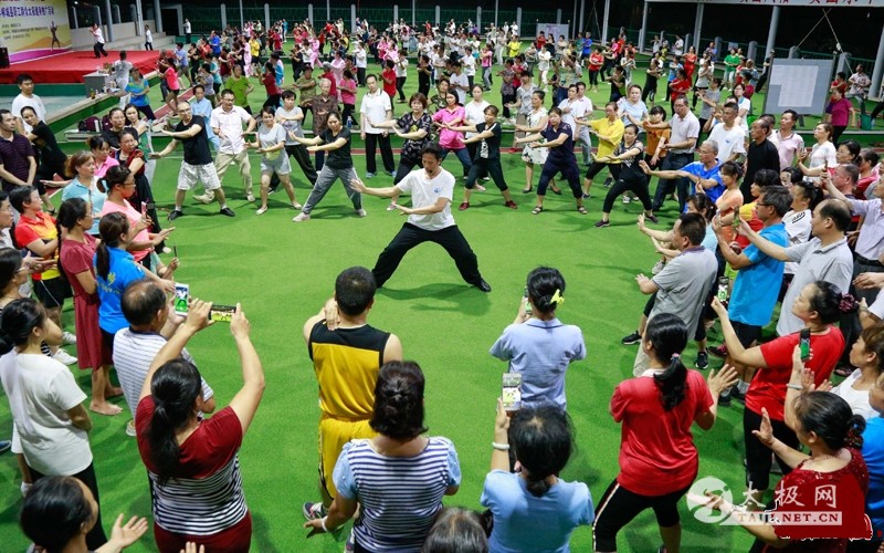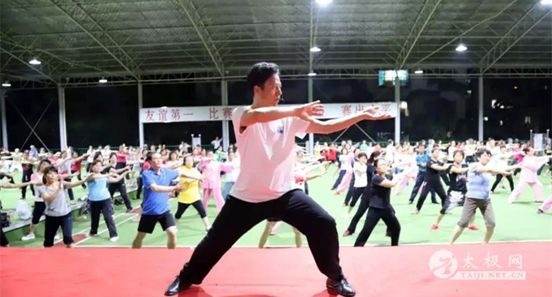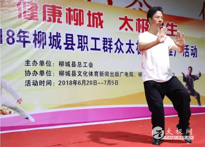 韩建民领练太极拳中 6月20日晚,陈家沟太极拳名师韩建民和柳城县近300多名职工群众在县老干局门球场同台献艺,场面甚是壮观!由柳城县总工会主办,县文化体育新闻出版广电局、县老年人体育协会协办的“职工太极健身推广和培训活动”在这里正式启动了。 汪永东致辞