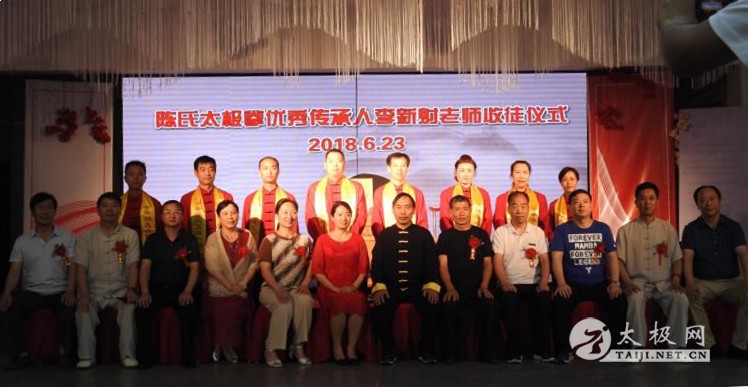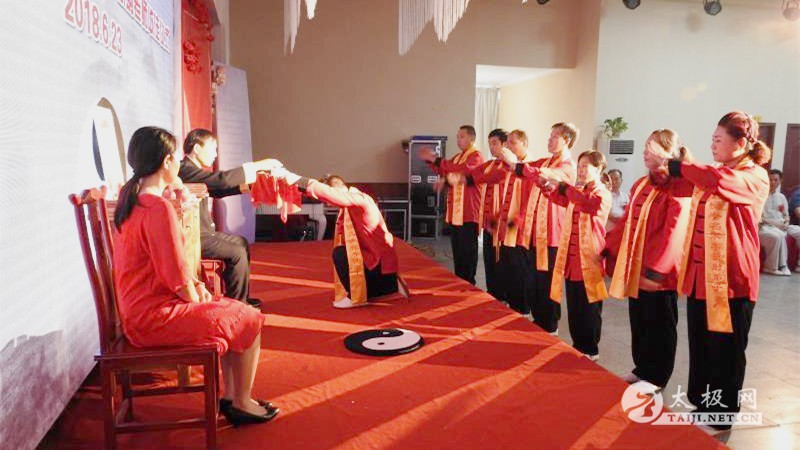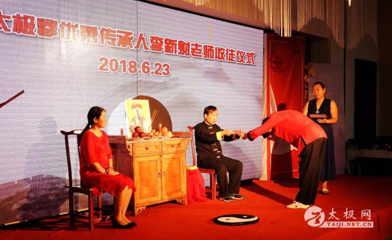 2018年6月23日(农历五月初十),平顶山市太极拳协会副会长、舞钢市太极拳协会会长、2017年太极网十大太极杰出青年,太极拳优秀传承人李新射老师收徒仪式在舞钢市隆重举行。活动由舞钢市音乐家协会副主席李向阳先生主持,在众领导嘉宾的见证下,徐惠雁、杨松杰、李平、张恩萍、王文军、李伟杰、巩新留、陈涛、罗宁等九名优秀弟子通过考核正式拜入李新射老师门下,为太极拳发展传承注入了新生力量! 现场嘉宾 平顶山市太极拳协会会长杨安、舞钢市太极拳协会常务理事袁自立作为本次收徒仪式的见证人出席活动。此外,出席活动的嘉宾有:原平顶山市文化局局长刘晟甫、平顶山市太极拳协会副秘书长辛文、舞钢市太极拳协会常务理事时哲豪、舞钢市太极拳协会秘书长赵辉、舞钢市太极拳协会副秘书长苗国正、舞钢市文联名誉主席、舞钢市女子书协主席温慧敏、舞钢市太极拳协会理事李聚才、舞钢市九润公司总经理张利迅、舞钢市申发钢铁贸易有限公司总经理刘全民、舞钢市宏宇陶瓷总经理刘继东等。 收徒仪式 收徒仪式遵循传统礼仪,庄严隆重。李新射老师夫妇老师首先向太极拳历代先贤敬香、祭酒、叩拜,感念前辈的传拳恩德,彰显太极拳代代相传、薪火相承之意。随后,新入门弟子宣读拜师贴,并依次上前叩拜先师,向师父递交拜师贴、行拜师礼、敬拜师茶。师父亲自为新入门弟子披挂绶带,预示着众弟子成为新的太极拳传承人。 李新射老师带领新入门弟子集体向太极拳历代先贤敬香并行叩拜大礼。随后李新射老师向新入门的弟子训话:“今天新收的9名弟子都是经过认真了解和考核,人品修为好,是一个合格的太极拳传承人,今天入门以后,希望大家尊师重道,严守门规,继续努力深造,为太极拳的传承发展做出更大的贡献。” 李新射老师向出席今天活动的嘉宾表示感谢,并表示,“将会继续尽心尽责,倾囊相授,使大家的武德拳艺更上一个台阶,共同将太极拳这一非物质文化遗产传承好,发展好,造福更多的人。” 本站编辑:太极网陈超 |