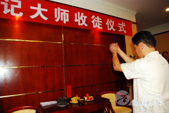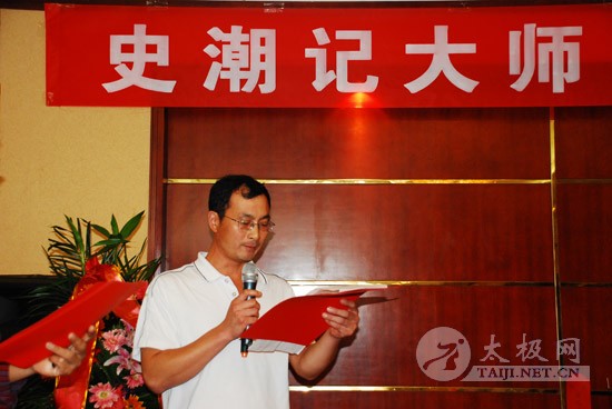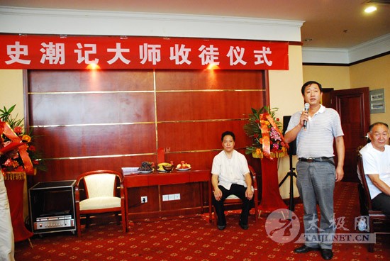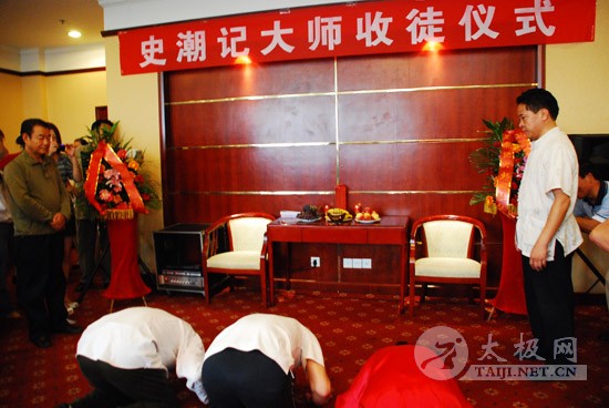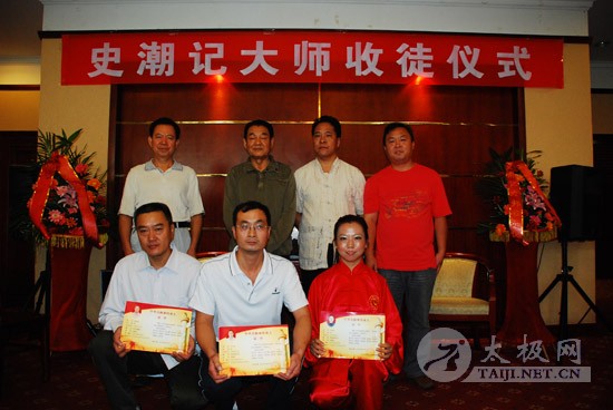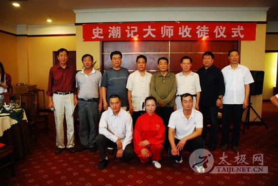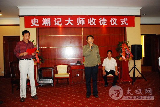 8月25日上午,焦作太极拳名家史潮记大师的收徒仪式在焦作东方宾馆举行。 本次拜师的赵煜光等三人成为史潮记大师的开门收徒的首批入室弟子。 焦作市人大常委会原主任郭安民、焦作市原政协主席、焦作市太极拳研究会会长赵功佩、陈家沟党支部书记兼村委主任陈皂罗、中华太极拳传承谱系工程领导小组办公室主任刘洪奇、焦作市原武协主席马洪德,以及众多太极拳名家、社会名流参加了收徒仪式。 此次收徒仪式按照传统方式进行,新入室弟子赵煜光、闫大勇、许艳春在史潮记的带领下,向太极拳先贤敬拜上香。鉴证人郭安民、赵功佩等分别致辞,向史潮记老师和新入室弟子表示祝贺。学生代表、新入室弟子代表也在发言中向老师表示衷心感谢,并表示一定将太极拳这一中华国粹很好的继承和发扬下去。刘洪奇向新入室弟子颁发了《中华太极拳传承人证书》,并和鉴证人、史潮记师徒一起合影留念。