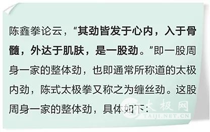 【神形合一的意念劲】 太极拳强调“以心行气、以气运身”,“中和元气,随意所之,意之所向,全神贯注”,要求在意念主导下修炼意气力、精气神完整合一的功力超常、魅力超常的“太极内劲”。 【松腰松胯的丹田内转劲】 太极拳劲力凝聚、运转的关键在腰部(丹田),“首先要把腰劲练出来”。腰胯在行拳中走立体横“8”字,形成丹田内转丹田做功,以内带外以气催形。 【出肾入肾的内气鼓荡劲】 一是气沉丹田丹田内气鼓荡。二是内气出肾入肾。静为入动为出,蓄为入发为出。为静为蓄时吸气、收腹、提肛,似以向上吸拔之气上行到命门处“入肾”;运劲发劲时, 脚掌脚跟向下蹬劲,靠作用于地面产生的反作用力传经腰胯的枢纽运转,命门把吸聚来的劲气传导到劲点(发力点),即“出肾”。 【至柔至刚的刚柔相济劲】 “太极拳乃柔中寓刚、棉里藏针之艺术”(杨澄甫拳论),必须从入静、放轻、放慢之中坚定不移地摧化掉僵劲拙力,化僵为柔,积柔至刚,至柔至刚,刚柔相济。 【劲走圆弧螺旋的缠绕折叠劲】 太极拳运劲非圆即弧、往复折叠、劲走螺旋,绝无直来直去的抽扯之形,定式造型也处处掤圆、非圆即弧。意圆,气圆,整体如气势饱满的圆球。所发劲力如出膛子弹,既有前进的抛物线路,亦有旋转前进的螺旋线路。 【八面支撑的对称平衡劲】 阴阳对称、阴阳平衡形之于拳就是手形手法、步形步法、身形身法的对称、平衡,内气、内劲的对称、平衡。比如,虚与实、开与合、刚与柔、快与慢、升与沉,左顾右盼、上领下沉、前发后塌,以及推手中的沾连粘随、引进落空、化打结合。