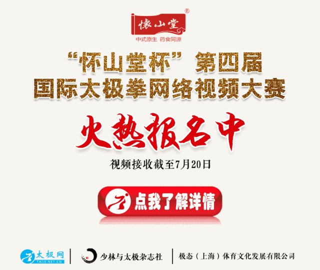 太极是身体的锻炼, 是心的旅行,是健康生活的方式, 更是探索生命意义的文化。 也许我们无法选择自己的容貌, 却可以通过太极, 淬炼自己的气质; 我们的确无法阻止岁月的流逝, 却可以用太极, 延缓身心衰老! 愿你永远年轻, 永远和太极一路同行! 期待您, 用镜头刻录自己美好的太极韶华, 用视频展现自己的太极英姿, “怀山堂杯”第四届国际太极拳网络视频大赛,寻找最美太极人, 我们在等您! |