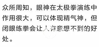 第一,闭目练拳会让人入静放松。 眯眼闭目,会专心贯注,让心静下来,对周围尘事置之不理,一心用在练拳悟拳上,让人进入高度凝神的境界中。由于心静,必然体松,也就是说,眯眼闭目练拳能让心情放松,关节放松,肌肉放松,体会到骨肉分离感,骨升肉坠感。美妙之感会让人增加练拳兴趣。 第二,眯眼闭目练拳有利让内气下沉,让劲道更顺。 眯眼闭目练拳,可以让动作轻柔缓慢,呼吸顺畅,有利内气下沉,内气下沉又会让下盘稳固,拳架端正,会让上肢轻灵,如风摆枊丝,会让中盘的腰必活,劲道顺畅,身上无僵劲、拙力而带弹性,打出的拳让人感到舒服,拳技也会上升到一个新的境界。