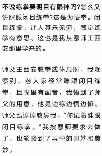 有人曾问我,你的功夫是怎么练出来的? 这有多方面原因,有苦练,有巧练,有悟拳。苦练是根本,是必须的,苦才出熟,熟才生巧,而巧是悟拳的结果。多年练拳也让我悟出了多种巧练太极之法,其中就有眯眼闭目练拳。