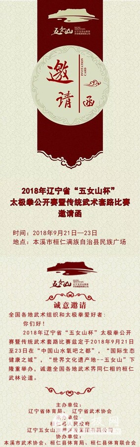 一、赛事名称 2018年辽宁省“五女山杯”太极拳公开赛暨传统武术套路比赛 二、竞赛时间和地点 时间:2018年9月21日—23日。地点:本溪市桓仁满族自治县民族广场 三、主办单位 辽宁省体育局、辽宁省武术协会 四、承办单位 桓仁县人民政府、辽宁五女山旅游开发集团有限公司 五、协办单位 本溪市武术协会、桓仁县体育局、桓仁县体育联合会 六、竞赛项目 1.太极类项目 (1)规定项目:陈式太极拳、杨式太极拳、吴式太极拳、武式太极拳、孙式太极拳、42式太极拳、24式太极拳、42式太极剑、32式太极剑。 (2)传统太极拳、械:陈式太极拳(器械)、杨式太极拳(器械)、吴式太极拳(器械)、武式太极拳(器械)、孙式太极拳(器械)、和式太极拳(器械)、东岳太极拳(器械)及其他传统太极拳(器械)。 (3)太极对练项目:各式太极拳、器械对练。 (4)太极集体项目:规定太极拳、械集体项目、传统太极拳、械集体项目 (5)太极推手 2.传统武术套路拳、械项目 (1)传统拳术: 一类:形意、八卦、八极 二类:通臂、劈挂、翻子 三类:地躺、象形拳 四类:查、花、华、炮、红、少林拳等其它拳种 (2)传统器械:单器械、双器械、软器械 (3)对练项目:徒手对练、器械对练、徒手与器械对练 (4)集体项目:集体拳术、集体器械、集体拳械 七、参加方法 (一)全国各地区的体育部门、武术组织、太极拳协会,各类院校、中小学,各类武术馆校、体校、俱乐部、活动中心、老年体协,各类企事业单位、机关团体及个人均可报名参赛。 (二)每队可报领队、教练、队医各1名,运动员人数不限。 (三)个人项目:每名运动员限报拳术1项、器械1项、可兼报对练项目和集体项目。 (四)对练项目:每队限报3项,每人限报1项,可陪练,性别、年龄组别不限。 (五)集体项目:每队限报集体项目1项。人数不得少于6人,少于6人时按照规则规定扣分。性别、年龄组别不限。 八、竞赛办法 (一)遵循中国武术协会审定的《传统武术套路竞赛规则》(2012)及有关补充规定。 (二)规定项目中陈式、杨式、吴式、武式、孙式、42式太极拳和42式太极剑分别采用原国家体委武术研究院编印的《太极拳竞赛套路》、《四式太极拳竞赛套路》、1996年编印的《武式太极拳竞赛套路》和1991年编印的《太极剑竞赛套路》。 (三)推手项目采用2015年《太极拳推手试行规则》。 (四)太极拳械、传统拳械等项目时间 1、太极拳项目:完成套路时间不超过4分钟,3分钟时裁判长鸣哨提示。 2、太极器械项目:完成套路时间不超过3分钟,2分钟时裁判长鸣哨提示。 3、太极对练项目:完成套路时间不超过3分钟,2分钟时裁判长鸣哨提示。 4、太极规定项目必须按照规定套路顺序演练,不得增减和改变动作,裁判长吹哨之后的剩余套路未完成不予扣分。 5、传统拳术、器械:完成套路时间不超过2分钟,1分30秒裁判长吹哨。 6、传统对练项目50秒至2分钟。 7、集体项目不超过4分钟,须配音乐(自备CD光盘或MP3播放器),音乐中不得出现说唱等内容,若出现说唱裁判长总扣0.1分,未配乐者裁判长总扣0.1分。比赛时,由本队教练或领队负责配合音响师播放音乐。 8、按照各项目运动员比赛顺序,每2~6名运动员一组,同场比赛,分别评分。 (五)年龄分组 儿童组:12岁以下(2007年1月1日之后出生者); 少年组:12岁至17岁(2001年1月1日至2006年12月31日); 青年组:18岁至39岁(1979年1月1日至2000年12月31日); 中年组:40岁至59岁(1959年1月1日至1979年12月31日); 老年组:60岁和60岁以上(1959年12月31日之前出生者)。 (六)推手项目 1、男子推手 48公斤以下级(含48公斤) 52公斤级(48公斤以上至52公斤,下同) 56公斤级 60公斤级 65公斤级 70公斤级 75公斤级 80公斤级 85公斤级 85公斤以上级 2、女子推手 55公斤级(50公斤以上至55公斤) 55公斤以上级 九、录取成绩与奖励方法 1、个人项目:按各单项各年龄组别男、女分别设一等奖30%、二等奖30%、三等奖40%。颁发获奖证书和奖牌。 2、对练项目:按徒手与徒手、器械与器械(含徒手与器械)及各式太极拳对练项目分别录取,录取比例和办法同个人项目。 3、集体项目:按拳术类、器械类、拳械类、太极规定项目、太极传统项目及各式太极拳分别录取一等奖30%、二等奖30%、三等奖40%,颁发获奖证书 4、各单项各组别男、女报名人数在5人(含5人)以下时,按同类项目不同年龄组别合并,男、女分别在同一组别内编组录取。 5、对比赛结果有争议的,必须于该项比赛结束后15分钟内书面向裁判委员会提出申诉,申诉费1000元,失败不予退费。 6、参赛人员均需签署《免责声明书》,并在报名时上交到组委会,凡未签署的选手不能参加比赛。运动员必须加强安全意识,遵守大会秩序,凡是违反安全规定和大会秩序的,取消比赛资格和名次;运动员年龄、健康状况均由各代表队自行审核,以报名单盖章或签字为确认依据。 7、设"武德风尚奖"和“优秀组织奖”评选办法另定。 8、比赛及赛后三天(21日-26日)持仲裁、裁判员、运动员、领队、教练等胸牌游览桓仁境内旅游景点享受票价半价优惠,免费参观“东北抗日义勇军纪念馆”。 十、报名与报到 1、报名网址:登录辽宁五女山旅游集团网页(www.lnwnsjt.com)下载报名表报名 报名邮箱:619921767@qq.com,或前往桓仁县体育局直接报名。 地址:辽宁省桓仁满族自治县黄河大街1号(教育园)体育局办公室 联系人:王志刚 。 联系电话:024-48822530 13188210488 2、报名截止时间:20