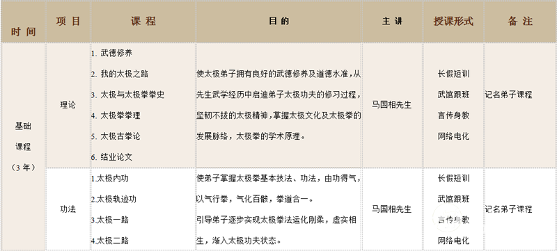 马传太极带徒工程委员会 第二届带徒工程招生简章 首届“马传太极带徒工程”于2015年5月正式启动,历时三年,于2018年结业,三年中,经组委会周密安排,严谨组织,马国相先生理论与实践相结合,亲自主持教学,圆满完成了教学计划,取得了可喜的教学成果,积累了丰富的教学经验,受到了太极界的高度重视和一致好评,被誉为太极拳传承的标杆。 首届带徒工程结束后,广大武术太极爱好纷纷致电、致函要求参加学习,应大家的要求,马传太极带徒工程委员会决定,于2019年启动第二届带徒工程,启动仪式将于2019年元旦举行。 带徒工程首创者马国相先生,师承于陈家沟太极名宿陈启旺、朱天才二位大师,自青年时期即崇尚太极武学,先后在东北、珠三角地区创办太极学校和武馆,传播太极。 2002年荣获全国陈氏太极拳十大名师称号;同年被国际太极拳年会评定为“太极拳名师”;2009年荣获国际太极文化传播大使称号。通中医,兼习诗文、书法、绘画,著有《我的太极之路》、《陈式太极功夫》系列、《太极拾零》、《中医太极拳》等专著。经过四十多年对太极武学的传承与实践,特别对时下太极传承偏离传统路径深感痛心,遂独辟蹊径,开创性提出实施“太极带徒工程”,以期以自身微薄之力,亲力亲为,致力于太极事业的正本清源、激浊扬清。 带 徒 制 意 义 带徒制是我国传统文化中重要的传承形式。通过父传子、师传徒的形式传承理论经验与技艺。长辈或导师通过口传心授,将自己的学术经验与技能传授给子女或弟子,弟子则通过口传身授,背诵传统古籍,心摹手追继承前辈的学术经验与技艺,并使之发扬光大,这种传承方式千百年来已被业内广泛认同。 师徒关系的确立(非家传),以情感的纽带,维系着传承的严肃性、连续性、无私性与持久性。历史上成功的武学大师、医学大师、艺术大师多出自家传或师徒制传承,其世代积累的学术经验,学术著作常被视为秘不外传的秘诀,一代一代传承下来,形成各门各派。师徒制传承形式,为高端专业人才的培养及传统文化的传承发挥了重要作用。 根据传统太极武学以家传为主,传内不传外,注重身传、言传、心传等传承特点,三年小成,六年中成,十年大成的传承经验,费时之长,非一般短期培训能够奏效。只有在导师长期有计划、有步骤、有针对性的精心培育下,才可能造就出高质量的太极成手、太极高手、太极妙手、太极神手。而这一切只有在稳定的家传背景与稳定的师徒关系前提下,才能够以心传艺,以艺立品,以品立德,造就一代优秀的太极传人。 太极修真、太极武学、诗书画印,同为我国宝贵的文化遗产,是中华民族在漫长的历史长河中积淀下来的宝贵的精神财富,在科技高速迅猛发展的今天,依然绽放出夺目的光彩,其间,师徒制传承功不可没。 为此马国相先生将祖传中医家学、书画、结合太极武学,历经数十年潜心求证的四大学术成果: 1.太极修真; 2.太极武学; 3.太极医学; 4.太极艺术(诗书画印等); 奉献给热爱传统文化的有识之士,并以带徒的方式面向世人,使其后继有人,薪火相传。 带 徒 宗 旨 1.面向全国,面向世界,面向未来,理论与实践相结合,科学设置教学方案,培养一批文武兼备、品学兼优、德艺双馨的太极拳教练人才,高级太极拳师,太极文化推广师,未来的太极拳家,太极拳大师,将带徒工程办成群星璀璨的“太极黄埔军校”。为太极职业化,知识化,科学化,全球化发展输出高端人才。 2.搭建国际性弟子平台,资源共享,济贫帮扶,互助互利,共谋发展,将带徒工程办成温馨和谐的“太极之家”。 本届带徒招生详情 一、课程安排: 课程设置一(必修课) 课程设置二(选修课) 1.基础功夫3年(记名弟子,师生相互考察期); 2.中级功夫2年(正式拜师后); 3.高级功夫2年(正式拜师后); 4.完成学业,认证评定。 带徒方式: 1.先生亲授与自修相结合。每年两次长假集中面授(首选)。 2.特授与基地教学相结合。不定期来太极基地接受先生特授的同时,可参加太极基地或武馆跟班学习。 3.理论与实践相结合,在修炼的同时,要求完成必修及选修理论、功法课程。 4.面授与网络教学相结合,定期与先生交流、释疑,接受指导。 5.游学与先生言传身教相结合,定期或不定期的选择静修胜地,进行天人合一的“闭关”修炼,以开阔视野,博采自然之气,提升太极功夫境界。 结(毕)业待遇及去向: 1.学期满三年的记名弟子,经考核合格,颁发由马国相先生签署的马传带徒工程(非入门弟子)结业证书。 2.学期满三年的记名弟子,经师生相互考察认可,记名弟子可向先生提交拜师申请,经马国相先生认可后,正式履行拜师手续,颁发马传太极入门弟子证书。 3.入门后四年的正式弟子,完成全部学业,经考核合格由马国相先生签署太极传人证书,并通过师门平台支持创建太极院校、传播机构、太极武馆、太极养生院等。 三、报 名 条 件 1.热爱太极事业,对太极文化有特殊感觉,对先生有敬仰之情,发愿终追随先生实现太极梦想。 2.中国大陆公民,无政治倾向,无不良记录,宗教信仰不限;具有高中以上学历。 3.有一定经济来源,确保每年定期或非定期学习费用。 4.身体健康,五官端正,男女不限,男身高165-185cm,女156-170cm. 年龄15-45岁之间。 5.有无太极拳基础均可(无其他太极拳基础最佳),学过其他拳艺者,建议学习期间暂时放弃前学,按序就班学习太极技艺。 6.带徒工程将全面继承太极技