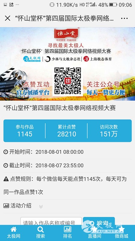 源自太极,网聚全球! 8月1日,万众瞩目的“怀山堂杯”第四届国际太极拳网络视频大赛网络展播及点赞通道正式开启,太极拳爱好者一年一度的网络狂欢如约而至。太极,因网更红!太极人的朋友圈再度被视频大赛霸屏,诸多“太极网红”被视频大赛这个“太极星探”平台挖掘,通过“互联网+太极” 展翅翱翔,“红”遍拳界! 本届大赛规模再创新高,各地拳友和太极拳组织共千余人参赛、1146部参赛作品,通过网络掀起太极风暴。 大赛虽已历经三届且备战多日,本届大赛展播平台开启之时,拳友们的高涨热情依旧让人震撼,通道开启一小时,展播平台访问量飞速突破151万,点赞量达28210次! 与此同时,展播平台每时每刻接收着来自全球各地数以万计的拳友留言互动,拳友们互相点赞的同时,纷纷为各自关注和喜欢的选手留言评论。视频大赛如同巨大的磁力场,吸引着各地拳友的关注和传播,传递着太极正能量。 拳友们纷纷表示“太极,以网会友,视频大赛太好了”!通过视频大赛交流互动、相互学习,同时交心、交朋友! 是颇具意义的太极交流活动。 大赛组委会及太极网团队严阵以待,全力以赴,力求保证展播平台和投票系统正常运转,大赛展播系统及太极网服务器承受住了疯狂的刷屏。保证了各参赛选手和组织顺利进行观看和点赞。 本届视频大赛展播首日再次刷新纪录!截止发稿时,视频大赛展播系统共收到拳友互动点赞214181次,展播平台点击量突破714万!展播平台访问量持续疯狂激增······ 这个盛夏,“太极+山药”的绝配!“怀山堂杯”第四届国际太极拳网络视频大赛将缔造哪些“太极网红”,寻找“最美太极人”又会有怎样的大美篇章? 大赛能否刷新或创下怎样的记录, 各项奖杯将花落谁家?敬请关注太极网后续报道! |