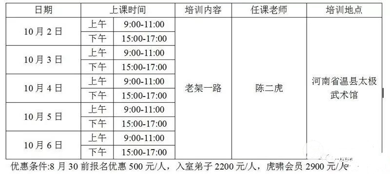 本着弘扬和传承太极拳的精神,应广大太极拳爱好者的要求。 陈家沟虎啸太极总会、陈家沟太极拳培训中心、温县武术馆馆长兼总教练陈二虎老师将举办陈式太极拳老架一路提高班。 陈二虎,陈家沟人,世界太极拳冠军、国家太极拳推手新规则制定人之一、全国太极拳推手培训班教练、太极推手擂台赛蝉联冠军、陈家沟太极拳“八大天王”之一。 培训内容: 一、陈式太极拳老架一路 二、周身的配合、上肢下肢与躯干的关系、呼吸与动作的配合 陈二虎老师独特的教学方式,让你更清晰的了解每一个动作 ,轻松掌握太极拳的要领(由武术馆学生全程提供陪练)。 培训对象:有一定的太极拳基础,身体健康,无传染性疾病的广大太极拳爱好者及全体虎啸会员。 培训时间:2018年10月2日至6日 具体安排 陈二虎老师拳照 培训地点:河南省温县太极武术馆(黄河路) 收费标准:收费3600元/人 优惠福利: 1:8月30前报名优惠500元=3100元/人; 2:入室弟子2200元/人; 3:虎啸会员2900元/人。 食宿交通费用自理。十一假期房源紧张,需要订房的请提前电话告知。 报名费:300元、报到时将归纳入学费中(请在汇款时标注姓名) 报名时间:即日起至2018年9月20日止,名额有限按报名顺序安排,1号报到2号开始上课。 报到地址:温县黄河路太极武术馆招生办 联系人:杨老师 电话:0391--6188588 13782714602 开户行:中国银行温县支行 帐号:6217-9080-0000-6008-038 户名:职莉萍 微信/支付宝扫码付款: 特别说明: 1.汇款后请电联或微信告知,同时请将您的身高体重告知报名老师。 2.提前报名,请勿空降,谢谢合作。 3.温馨提示:十一期间为出行旅游的高峰期,参加培训班的学员请一定要提前订往返票,方便出行。 4、本期培训结束后,颁发由陈二虎老师亲笔签名结业证书、赠送集体合影照。 乘车路线:全国火车、动车、高铁到郑州火车站、焦作火车站,可转乘汽车直达温县汽车站,出站左转300米即到太极武术馆; 郑州新郑机场大巴途经郑州高铁莆田站,每天发5班车直达温县,机场大巴电话:15978763008 、15138083800 、15978763006 |
