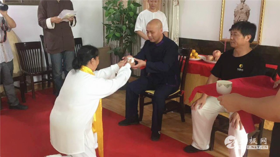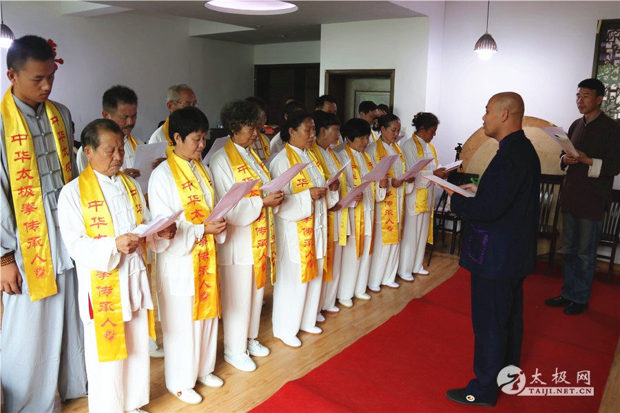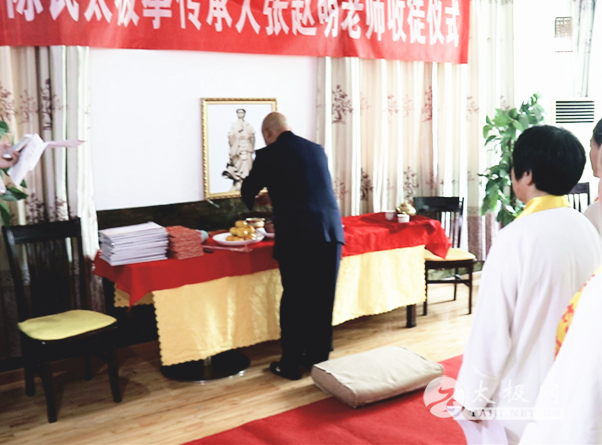 (太极网报道)9月1日上午10点30分,陈氏太极拳第十三代传人张赵明先生收徒仪式在南京谷里良茂酒店隆重举行。来自全国各地的太极拳爱好者拜入张赵明老师门下,正式成为陈氏太极拳传承人。 现场嘉宾 收徒仪式开始,张赵明先生带领新入门弟子向祖师爷上香。 新入门弟子向师爷陈玉勇敬茶 新入门弟子向师父张赵明敬茶 张赵明先生向新入门弟子宣读门规戒律,他说:拜师只是成为太极拳传承人的开始,对师父和弟子的要求都进步提高,要肩负起传承和传播太极拳的责任与担当,需德艺兼修,时刻以太极拳传承人的身份要求和完善太极修行。希望弟子们练好拳、教好拳、做好人,为太极文化传播和发展做出自己应有的贡献,传播健康造福社会。 新入门弟子入门宣誓 师叔上台发言 新入门弟子郝东升代表上台发言 新入门弟子与师父合影留念 收徒仪式圆满结束,张赵明老师向今天参加活动的嘉宾表示感谢,同时希望新入门的弟子能够恪守门规祖训,认真习练太极拳,用心体悟太极文化,不忘初心,为早日成为合格的太极拳传承人不懈努力,为太极拳的传播和推广做出应有的贡献。 责任编辑:太极网辛 |