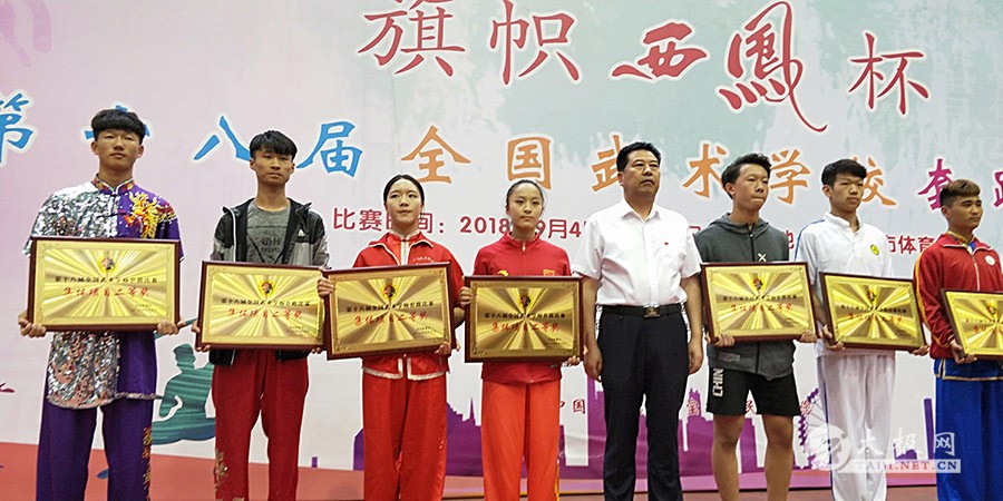 (太极网宝鸡分站白惠霞报道)由国家体育总局武术运动管理中心、中国武术协会、陕西省体育局、宝鸡市人民政府主办,陕西省武术运动管理中心、陕西省武术协会、宝鸡市体育局、宝鸡市金台区人民政府承办,宝鸡市武术协会协办的陕西西凤酒集团公司总冠名的“旗帜西凤杯”第十八届全国武术学校套路比赛,经过4天的激烈角逐9月9日在宝鸡市体育馆圆满落幕! 出席闭幕式的领导和嘉宾 本次比赛总裁判长李英奎宣布比赛成绩,国家体育总局武术运动中心青少年部负责人童昊宣布体育道德风尚奖名单。 来自全国各省、自治区、直辖市的95所武术学校426名少年精英经过四天的精彩巅峰对决,豪夺本次比赛各项别冠军25人、亚军25人、季军25人,西北武术院夺得了集体项目冠军。竞技获优秀、圆梦大陈仓! 宝鸡市武术协会主席陈东生给获得各项目的季军的运动员颁奖 国家体育总局武术运动中心青少年部负责人童昊给获得道德风尚奖的代表队颁奖 |
