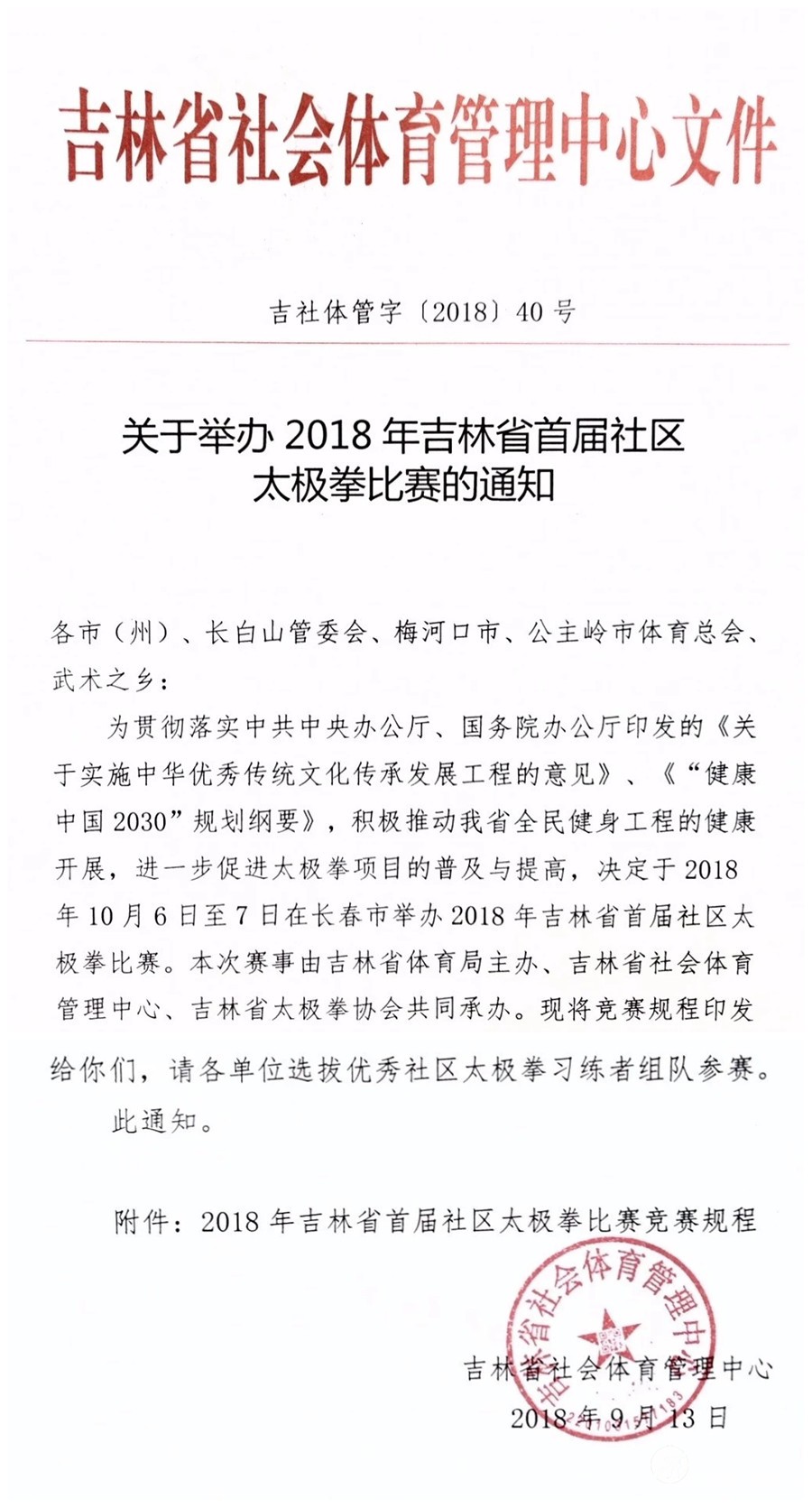 2018年吉林省首届社区太极拳比赛竞赛规程 一、主办单位 吉林省体育局 二、承办单位 吉林省社会体育管理中心 吉林省太极拳协会 三、竞赛日期和地点 (一)时间:2018年10 月6-7 日 (二)地点:东北师范大学综合体育馆 四、参加单位 吉林省范围内的各个区(县)、全国武术之乡均可选派1支社区队伍参赛。 五、参加办法 (一)每队限报运动员6人,其中男、女运动员各3名,领队、教练员可兼报。每名运动员限报太极拳术1项、器械1项,可兼报集体项目。 (二)每队限报集体项目1项。人数不得少于6人,少于6人时不予编排。性别、年龄组别不限。 (三) 参赛运动员需持当地县级以上医院的近期健康证明,由各队领队审验,每个运动员需参加人身保险,并由各队自行负责,否则不允许参赛 (四)每名运动员认真参阅本次大赛责任声明书全部事项内容及要求,认真填写并执行。 六、竞赛项目 (一)个人项目 1.拳术: 陈式太极拳、杨式太极拳、吴式太极拳、武式太极拳、孙式太极拳、42式太极拳、太极(八法五步)拳、24式太极拳。 2.器械:32式太极剑、42式太极剑。 (二)集体项目 太极(八法五步)拳。 七、竞赛办法 (一)比赛按中国武术协会印制的2012年版《传统武术套路竞赛规则》及有关补充规定执行。 (二)42式、陈式、杨式、吴式、孙式、武式太极拳和42式太极剑分别采用原国家体委武术研究院编印的《太极拳竞赛套路》、《四式太极拳竞赛套路》、1996年编印的《武式太极拳竞赛套路》和1991年编印的《太极剑竞赛套路》以及2018年8月8日国家武管中心推广的太极(八法五步)拳。 (三)竞赛时间 1.太极拳项目:完成套路时间不超过4分钟,3分钟时裁判长鸣哨提示。 2.太极器械项目:完成套路时间不超过3分钟,2分钟时裁判长鸣哨提示。 3. 规定项目必须按照规定套路顺序演练,不得增减和改变动作,裁判长吹哨之后的剩余套路未完成不予扣分。 4. 集体项目不超过4分钟,须配音乐(自备CD光盘或MP3播放器),音乐中不得出现说唱等内容,若出现说唱裁判长总扣0.1分,未配乐者裁判长总扣0.1分。比赛时,由本队教练或领队负责配合音响师播放音乐。 (四)年龄分组 少年组(A组):17岁以下(2001年1月1日之后出生者); 青年组(B组):18岁至39岁(1979年1月1日至2000年12月31日); 中年组(C组):40岁至59岁(1959年1月1日至1978年12月31日); 老年组(D组):60岁至70岁(1948年1月1日至1958年12月31日之前出生者)。 八、录取与奖励办法 (一)各项目设一、二、三等奖(分别为实际参赛队伍数量的20%、20%、30%,四舍五入),未获奖运动员颁发“优秀表演奖”。 (二)各参赛组别人数不足6人的单项,与其它年龄组别合并录取,录取比例和办法同个人项目。 九、竞赛机构 (一)设竞赛监督委员会、仲裁委员会、裁判委员会。 (二)裁判员由组委会在全国选调国家级和国际级裁判员。 (三)竞赛机构其他人选由组委会统一安排。 十、参赛代表队及运动员个人费用 (一)参赛人员差旅费自理,赛会期间食宿费由大会负责。 (二)本次比赛不收取报名费。 十一、报名、报到 (一)本次比赛实行网络报名。 (二)各代表队于2018年9月25日13:00时前在系统中完成报名,并于9月27日13:00前发送加盖公章的网络报名回执至指定邮箱,逾期不受理。 (三)各代表队于2018年10 月6 日13:30时到吉林省太极拳协会报到。 报到地址:吉林省长春南关区人民大街5502号。 联系人: 杜旭 (电话:178 0808 6760 ) 大会报名办公室电话:0431-82980999 报名电子邮箱:jlstjq@163.com 报名网址: www.jlstjq.com 十二、其他 (一)请各参赛队领队和教练,于10月6日下午16:00按时参加组委会和技术联席会,具体地点见报到须知。 (二) 请运动员须自行办理赛会期间的《人身意外伤害保险》和《健康证明》,未办理者,不予参赛。 (三)各参赛队报到后,大会医务组将对运动员的身体健康状况进行抽查,如发现问题,取消参赛资格。 (四)各队报到后,请认真阅读秩序册内容,若项目、姓名有异议者,务必于10月6日19:00之前,由本人或领队、教练填写申请表并签字递交大会组委会竞赛部(并注明签字人联系电话),经编排记录长审查,若提出申请内容与原始报名表相符者,予以更改,与原始报名表不相符者,不予更改。 (五)参赛运动员须在赛前30分钟参加检录,上场前在检录处等候,3次点名未到,按弃权处理。 (六)参赛运动员无故弃权者,取消本人全部比赛成绩。 (七)参赛运动员须穿着武术服装、武术鞋。 (八)各参赛队名称要求在10个字以内,不允许出现中国、中华字样。 (九)此规程和规则可在吉林省太极拳协会网站下载:http://www.jlstjq.com (十)未尽事宜,另行通知 |