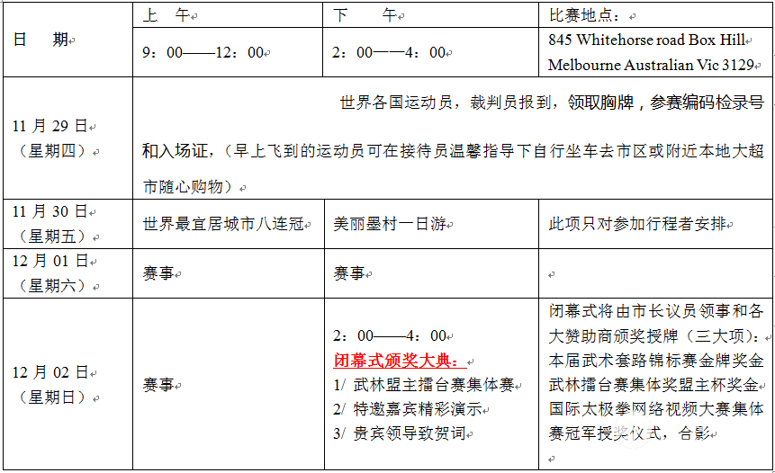 “纵横四海”澳大利亚首届中华国际武术节 (2018年澳大利亚首届旅游、武术交流文化节大型活动) 致世界各地武术界同仁: 第一届澳大利亚中华国际武术节将于2018年11月29日至12月5日在美丽城市墨尔本隆重举行!竭诚欢迎武术界友人来澳参赛、交流学习及观光旅游! 诚邀武林朋友共襄武术盛举,“纵横四海”澳大利亚首届中华国际武术节欢迎您的参与协办!满 15人参赛运动员团队向组委会输送大赛裁判一名。 让我们中澳运动员携手共进!传承国粹,推广中华武术走向世界! 一、“纵横四海”澳大利亚首届国际武术节2018 年11月29日-12月05日赛期安排: 二、“纵横四海”参赛单位 境内外各武术协会、武术馆校、其它社会武术组织和个人均可报名参加。 三、“纵横四海”竞赛方法和指南 1.本次比赛为个人项目赛和集体项目赛 2.本次套路比赛按中国武术协会 2012 年审定的《年武术套路竞赛规则》和 2015 年印发的《太极拳推手试行规则》和相关补充规定执行。 3.两版规则均能在中国武术协会官方网站下载:www.wushu.com.cn 四、“纵横四海”竞赛项目 (参照纵横四海首届国际武术节套路项目分类表1~表5) 五、“纵横四海”专案竞赛时间 1、单练专案:2分钟以內。 2、太极拳:完成套路时间不超过4分钟。演练至3分钟时,裁判长鸣哨提示。 3、太极器械、木兰拳、木兰器械、太极柔力球:完成套路时间不超过3分钟。演练至2分钟时,裁判长鸣哨提示。 4、对练专案:1分钟以內;太极对练、推手完成套路时间不超过3分钟。 5、集体专案:武术套路、健身气功限6人以上,柔力球8人以上,演练时间4分钟以内,须配音乐(自备播放器),音乐中不得出现说唱等内容,否则,裁判长总扣0.1分,未配乐者裁判长总扣0.1分。比赛时,由本队教练或领队负责播放音乐。 6、规定项目必须按照规定套路顺序演练,不得自行增减和改变动作,裁判长吹哨之后的剩余套路未完成不予扣分。 六、“纵横四海”三大赛事 1.武术套路锦标赛 (1)单练专案:按组別、专案、男、女分別按各单项各年龄组别设一等奖20%、二等奖30%、三等奖20%。录取比例按照实际参赛人数采取四舍五入的办法计奖。参赛人数不足6人的单项,编入其它组别或其它拳种比赛录取。各組分別頒发冠軍亞軍季軍奖牌、证书,其余颁发参与纪念奖证书。 (2)对练专案:可跨年齡组,太极、推手类对练以队 (对)中年齡最低者为准,非太极、推手类对练以队(对)中年齡最高者为准,不分性別,录取办法和颁奖与个人项目相同。 (3)集体专案:可跨年齡组,太极类以对(对)中年齡最低者为准,非太极类以队(对)中年齡最高者为准。按组別、专案和参加队伍中总按拳术类、器械类(拳术和器械混编项目归属器械类)评分以技术分乘於人数总積分。录取和颁奖方法与个人项目相同。 2.精英奖重奖悬赏武林高手:(精英奖产生方法查附件五) (1)“纵横四海”個人武术套路全能奖录取条件和奖励方法: 全能运动员必須参拳术一项、器械项、对练一项,共三个专案,方可参加全能評比。 第一名(全场全能冠军取得者中最高分),除了颁发个人全能证书和奖牌之外,还赠送高达3888.88澳币的全能冠军特别奖。 (2)“纵横四海” 拳,器械双冠军录取条件和奖励方法: 参赛运动员在同时取得任何拳种和任何器械的双冠军后,赛委会将根据(全场双冠军取得者中最高分)除了办法个人全能证书和奖牌之外,还赠送高达1888.88澳币的双冠军荣誉奖。 (3) “纵横四海”单项冠军录取条件和奖励方法: 赛委会将根据(全场单项冠军取得者中最高分)除了頒发個人冠军证书和奖牌之外,还赠送888.88澳币的单项冠军奖。 (4)“纵横四海”精英奖奖学金录取条件和奖励方法: 为鼓励世界太极爱好者学习中华国粹的热情,本次大赛将对(除中国国籍外)的参赛个人(金,银,铜得奖总分最高者提供武功深造奖学金免费保送去世界太极发源地中国进行深造提高的机会(机票住宿和学习课程费用全包) (5)“纵横四海”形象大使奖录取条件和奖励方法: 为鼓励世界中华太极传承推广热情,本次大赛将对(除澳洲国籍外)参赛个人(金,银,铜得奖总分最高者提供形象大使豪华游免费待遇(免费悉尼,堪培拉,黄金海岸7日游) 附注:个人奖项颁奖奖项不重复领取。 3. “纵横四海”武林擂台赛2018 年集体赛武林盟主奖: 武林擂台赛团体奖必须是15人以上运动员的集体方可参加評选,不分组別、专案,直接晋级进入闭幕式的武林盟主擂台赛。团体冠军1名,授予武林盟主獎金$ 1888.88澳币;团体亚军2名;团体季军3名. 设立此奖,旨在促进武术的推广和普及,鼓励海內外运动员积极参与。以分数乘以人数的总积分。全场集体赛冠军取得者中最高分者也能直接晋级选送闭幕式和15人以上集体赛运动员一起争霸武林擂台赛。 七、“纵横四海”仲裁委员会和裁判员 1.仲裁委员会人员组成和职责范围按《仲裁委员会条例》执行,由大会组委会统一选聘。 2.裁判员由组委会统一选调,裁判员需自备黑色裁判服和黑皮鞋。 八、“纵横四海”报名规定 1.报名截止时间为 2018 年 11 月 03 日 2.世界各国各地区的武术爱好者均可组队参赛,须两人组队方可参加,可用赞助企事业的名义参加(烟酒类企业除外)。 3.套路比赛每名运动员限报拳术 1 项、器械 2 项。可兼报对练项目和集体项目和推手项目。每支代表队限报对练项目 1 项。编组限 2 人,男、女可混合编组,不设年