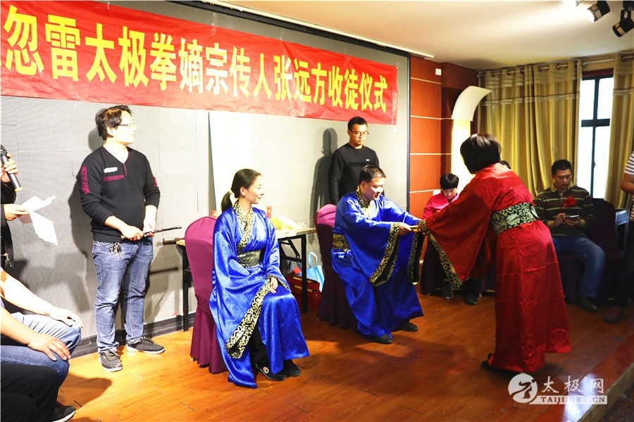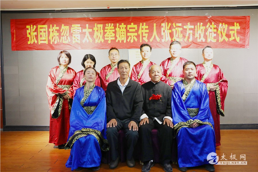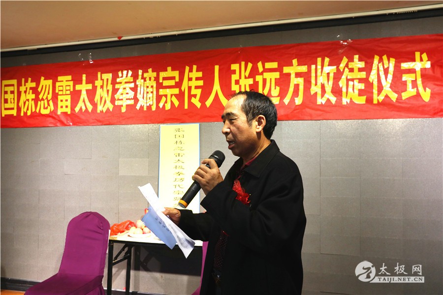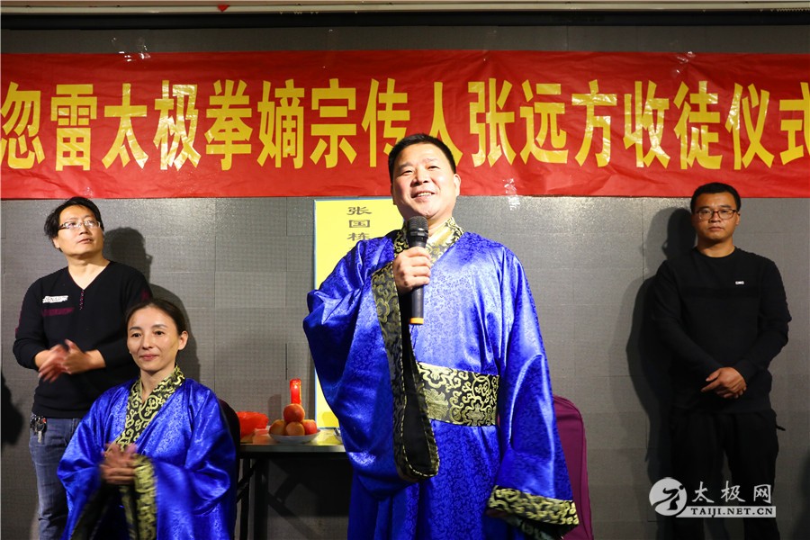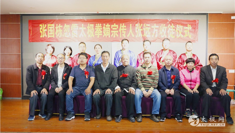 (太极网报道)10月4日,张国栋忽雷太极嫡宗传人张远方收徒仪式举行,张兵、苗亚斌、香笑华、李民、陈静、刘伟红六名太极拳爱好者拜入张远方老师门下,荣升为忽雷太极拳传承人。 收徒仪式由原福全主持,参加收徒仪式的还有 温县太极拳武术文化管理中心事业部主任 姬会敏 温县民政局社会组织科科长 殷红卫 太极网创始人 刘洪奇 陈辛庄村支部书记 周秋芬 陈辛庄忽雷太极拳协会名誉会长 陈保根 郑大体育学院教授 申国卿等