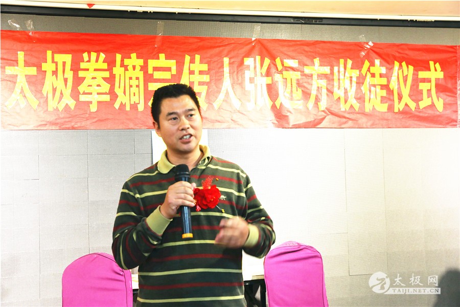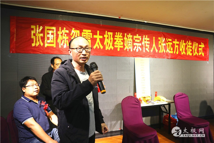 师徒合影 见证人姬会敏、殷红卫、申国卿先后发言,祝贺弟子得遇名师,祝贺张远方老师喜收佳徒,对张远方老师在太极拳传播推广工作上的贡献给与高度肯定,寄望大家共同携手继续发扬光大太极拳。 刘洪奇代表太极网、太极拳传承人联合会向张远方先生以及他的弟子们表示祝贺,希望弟子们用心习练太极拳,努力成为合格的太极拳传承人。