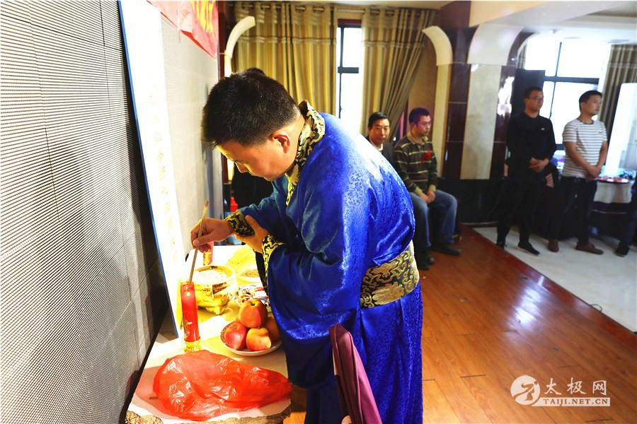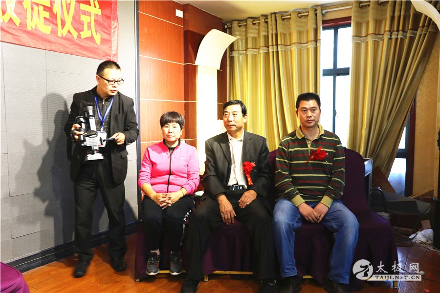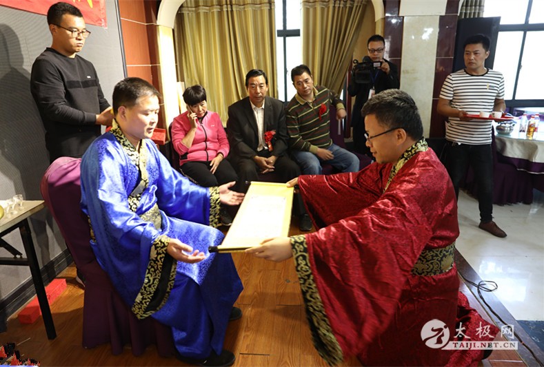 原福全主持 收徒仪式开始后,张远方向忽雷太极拳先祖上香敬酒。随后,弟子依次上前向师父师母行拜师礼,师父为其颁发入门证书。新入门的六位弟子在师父的带领下共同向先祖行礼,以示太极拳代代相传,薪火相承之意。