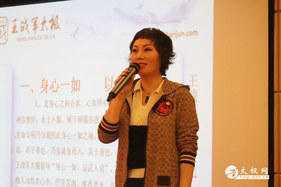 郑雪清主讲 本次王战军太极心法课由太极拳新一代领军人物、著名武术家王战军主持,王战军太极协会会长郑雪清主讲。课程以“身心一如·以武入道”的王战军太极文化核心理念为发起点,将佛学、道家、哲学等文化巧妙的融为一体,阐述了太极拳的习练者真正应当追求的是“形而上”的道,而并非“形而下”的器这一理念。郑雪清会长结合日常生活中的实际例子用通俗易懂的语言解释了修行过程中如何“修心”的核心问题。