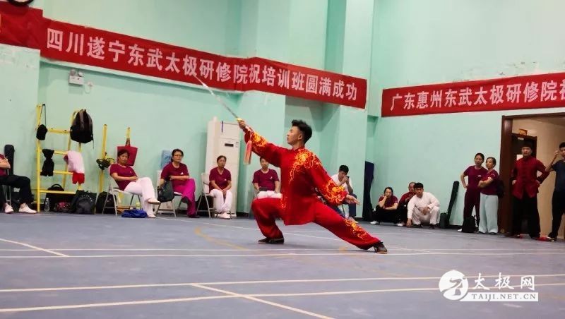 教练组也带来了精彩的太极拳、械的展示把现场气氛推向高潮。 院长徐勤兰老师表演了云水太极扇惊艳全场。 教练张宇浩表演太极剑,把太极剑的刚柔相济,快慢相兼表现的淋漓尽致,令全场叹服。 至此一切圆满之际张东武老师宣布本届培训班圆满结束,东武太极研修院为即将回程的拳友们准备了丰盛的欢送晚宴,大家推杯换盏把酒言欢,共叙友谊,相约下届培训班再聚。 责编:太极网小杨 |