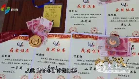 由佛山电视台南海分台与南海区文化体育局、 南海区武术协会联袂打造的 《南海好功夫》 介 绍 陈紫怡,7岁,陈家沟小学一年级学生。4岁便跟随父亲陈建翔在南海练武,上学后便回到老家上学、习武,但每逢寒暑假便会来到南海,在其父亲身边勤学苦练太极拳。 当说起为何让只有4岁的小孩练太极拳,其父亲说到,其实是从一个“教育”开始的。 “说来也算是一个笑话吧,孩子吃饭比较慢,也不怎么爱吃,我们就惩罚她蹲马步,马步一蹲,发现还挺像样的,然后从那时候开始,逐渐从一些简单的动作入手教, 孩子也听话,也喜欢去学,喜欢去问,从那时候开始就慢慢地学起来了。” 虽然紫怡只有7岁,但已获奖无数。2015年,首次参加比赛的紫怡,获得第二届佛山市传统武术锦标赛铜奖。 从此,紫怡不断参加比赛,无论是南海的还是陈家沟的,甚至广东省的比赛,她都屡获佳绩 。 在其中一次比赛中,还获得“太极萌娃”的称号,4岁起便习武的紫怡,对比同龄人,身体素质与精气神也略胜一筹,而练拳,对孩子的独立性和自律性都很有帮助。 除此之外 陈建翔最希望的还是能让陈家沟太极拳一代代地传承下去,能够发扬光大。 近日,紫怡还正式拜入陈家沟陈氏20世太极拳第12代传人陈炳门下学习太极拳拳法,修身悟道,传承发扬。
