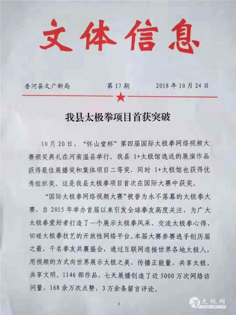 (太极网报道)2018年10月20日,“怀山堂杯”第四届国际太极拳网络视频大赛颁奖典礼在河南温县举行。香河县1+太极馆选送的展演作品获得最佳展播奖和集体项目二等奖,同时1+太极馆也获得优秀组织奖。这是香河县太极拳项目首次在国际大赛中获奖。 “国际太极拳网络视频大赛”被誉为永不落幕的太极拳大赛,自2015年举办首届以来引发全球拳友高度关注,为广大太极拳爱好者打造了一个展示太极拳风采、交流太极拳心得切磋太极拳技艺的开放性网络平台。本届大赛参赛选手创历届之最,千名拳友共襄盛会,通过互联网连接世界各地太极人,用视频的方式向世界展示太极之美,传播正能量,共享太极、共享文明。1146部作品,七天展播创造了近5000万次网络访问量,168余万次点赞,3万余条留言评论。 近年来,1+太极馆一直致力于陈式太极拳的传承与推广培养了众多太极拳爱好者,为香河县全民健身活动的开展和传播中国优秀传统文化做出了积极的贡献。此次1+太极馆在国际大赛中获奖的消息十分鼓舞香河县的太极拳爱好者们,大家都更加坚定地要把习练太极坚持下去,同时也更期待明年的视频大赛可以参与进来,与更多的拳友切磋太极,传播健康。 |