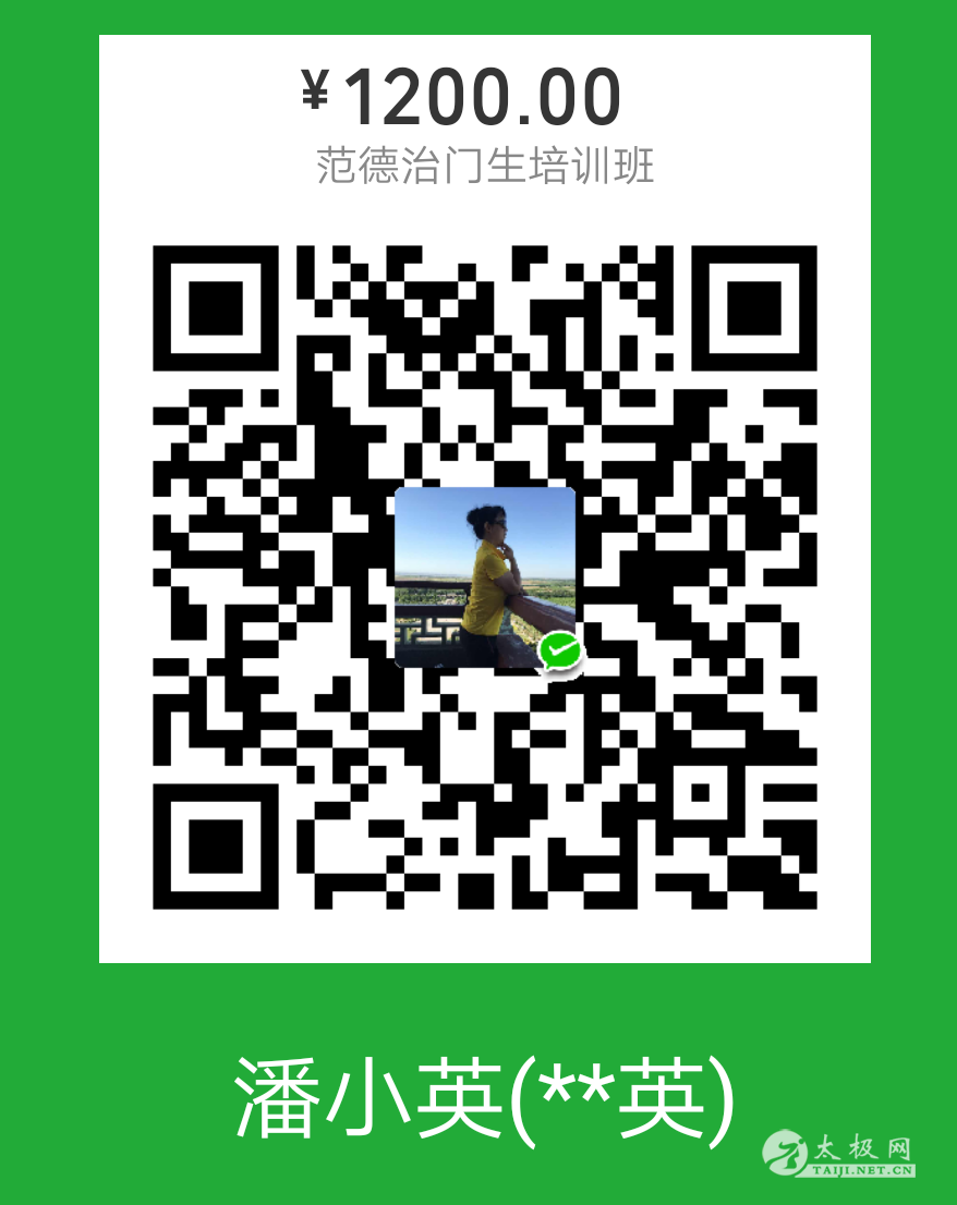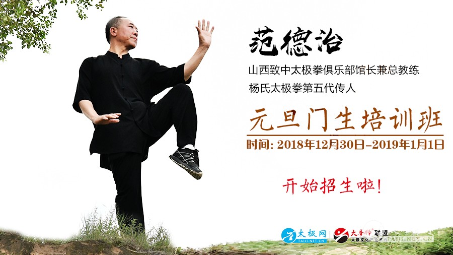 首批入室弟子培训班合影 ![]() 范德治老师授课现场 ![]() 范德治武术档案 自幼习武,跟随查拳名家刘从芳老师练拳,学习长拳类器械。后专攻杨氏太极拳,数十年不辍,力求融汇。2005年拜在杨振铎大师门下,成为其入室弟子。 现为山西致中太极拳俱乐部馆长兼总教练,太极网首席武术导师、《大拳师·百家讲堂》主讲人。国家一级武术裁判员、一级社会体育辅导员、中国武术六段、山西省首批武术段位制指导员、考评员、太原市残联轮椅健身队总教练、中残联轮椅太极拳系列创编者、山西省武协委员、山西省能源学院太极拳客座教授、山西晋旅集团投资有限公司太极拳顾问、山西省永和县荣誉市民。 范德治太极拳形象展示片 太极拳名家范德治老师2019年元旦培训班公告 太极网倾情推荐 一、培训时间 2018年12月30日至2019年1月1日(元旦放假期间) 二、培训地点 山西太原工人文化宫二楼、致中太极拳培训中心 三、培训费用 1200元/人(12月1日前报名送练功服一套);食宿费自理,可联系培训班会务组协调安排。 汇款账户: 1.银行转账: 账号:4367 4202 6290 2037 933(中国建设银行) 开户人:潘小英 2.微信转账: