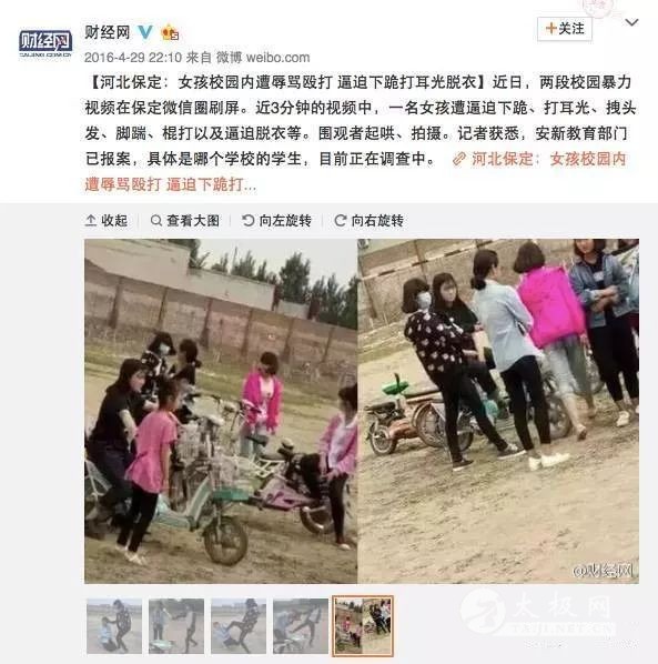 短短40秒,被扇了不下20次,被打女生一动不敢动,表情呆滞,满脸通红。当地教育局的工作人员表示,只是同学之间开玩笑而已。 而河北保定的一起校园霸凌事件中,一名女孩遭逼迫下跪、打耳光、拽头发、脚踹、棍打以及逼迫脱衣等。