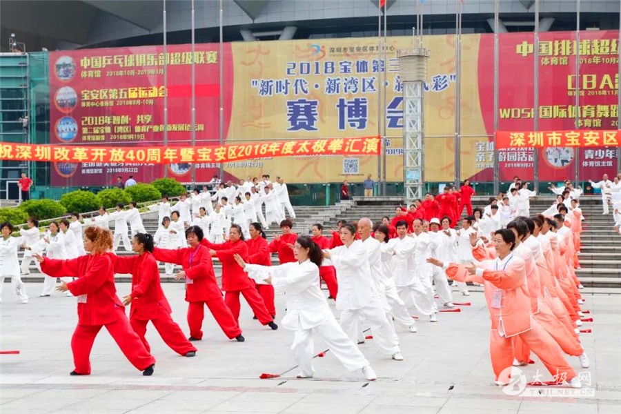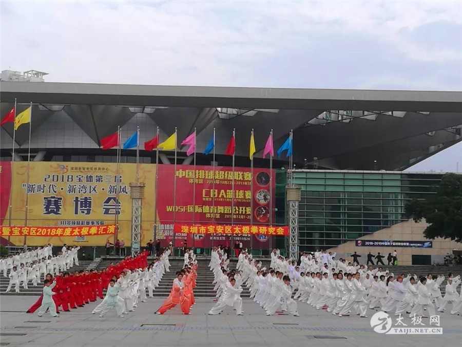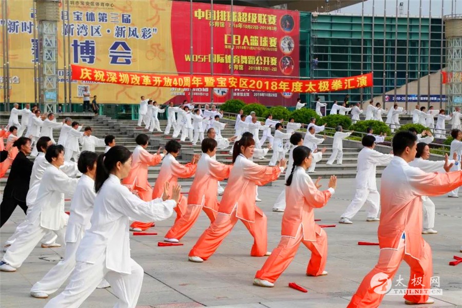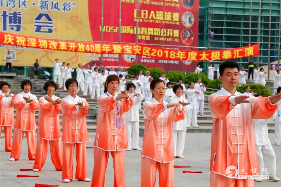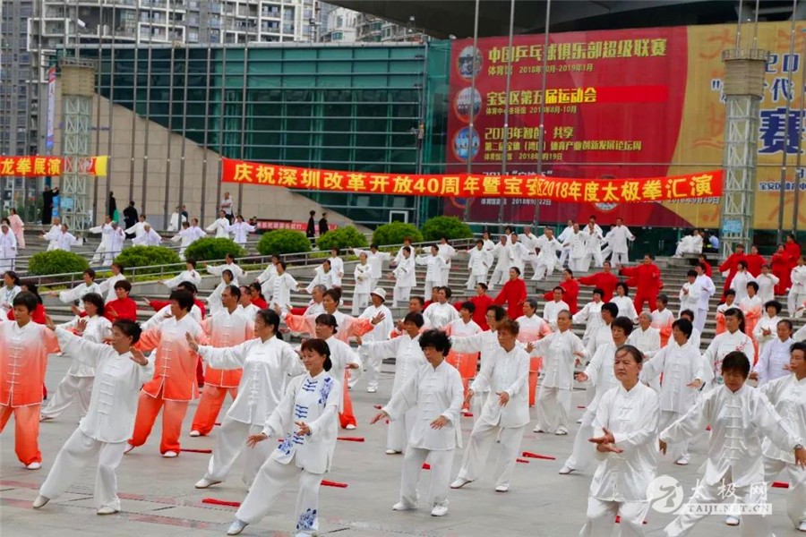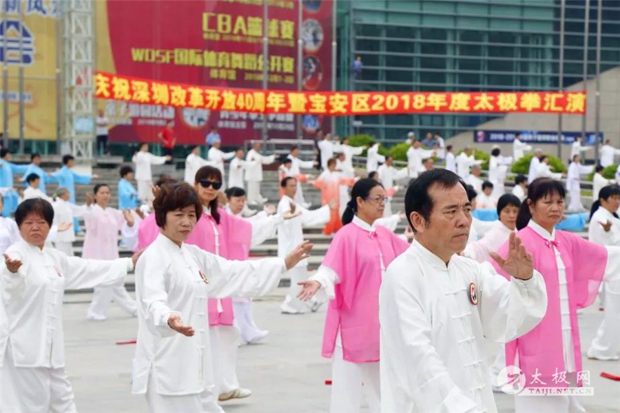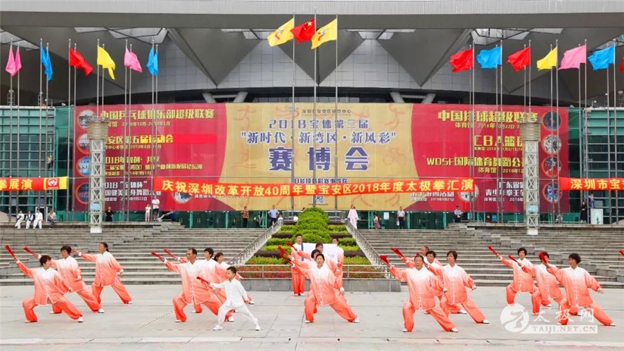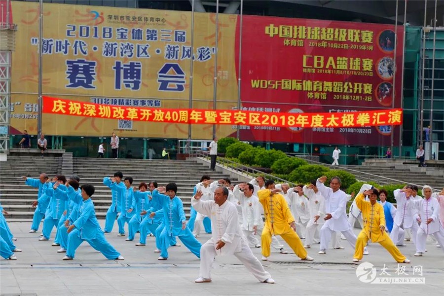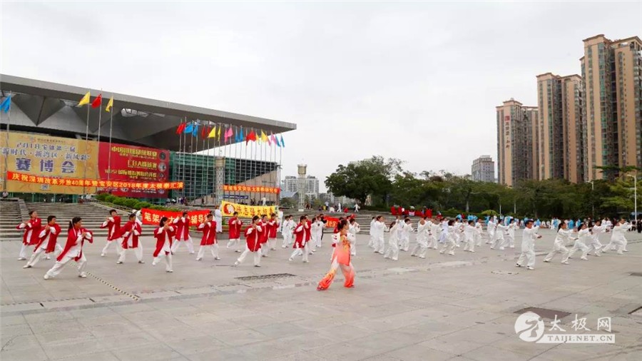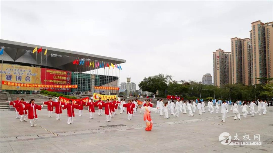 为庆祝深圳改革开放40周年暨深圳市宝安区太极拳研究会成立一周年,宝安区太极拳研究会于2018年11月10日在宝安体育馆南门广场举行了隆重的太极拳汇演活动。此次汇演共有28支队伍700余人参加,其中宝安区22个辅导站,福田、罗湖、龙华、南山、龙岗等区的6支队伍应邀参加表演。精彩的拳艺汇演传承了太极文化的精髓,展现了新时代太极人的风采。 出席此次活动的嘉宾有: 宝安区文体旅游局副局长卢清 宝安区文体旅游局体育科科长刘永祥 宝安区老龄办陈冰 深圳市太极拳研究会党支部书记、副会长杨广德 深圳市太极拳研究会副会长、深圳市社会体育指导员协会会长助理刘筠 中国武术七段、大宋体育产业股份有限公司董事局主席、杨氏太极第五代传人、宝安区太极拳研究会技术总顾问宋斌 天年之家柏慧 中国武术六段、中国武术段位制考评员、指导员、宝安区太乙游龙拳主要传播者江慧莲 杨氏太极拳103式深圳主要传播者魏国梁、石秋莲、肖佑光 中国武术六段、国家一级社会体育指导员、中国武术段位指导员、考评员、中国武术二级裁判员魏兆兰 中国武术六段、深圳市龙华区福城湘燕太极拳协会会长刘彩艳 武当赵堡太极拳第十四代传人、罗湖区品之唐太极拳协会会长唐仲春 陈家沟太极拳第十三代传人、深圳市太极拳研究会常务理事兼坂田太极辅导站站长龙秀文 中国武术六段、陈氏太极拳第十二代传人付碧云 陈式小架太极拳第11代传人贾洪新 宝安区太极拳研究会会长谢勤先生致欢迎辞,表示将继续开展各项培训和活动,不断提高会员的技术水平,让每一位参与者都享受太极拳带来的快乐与健康。