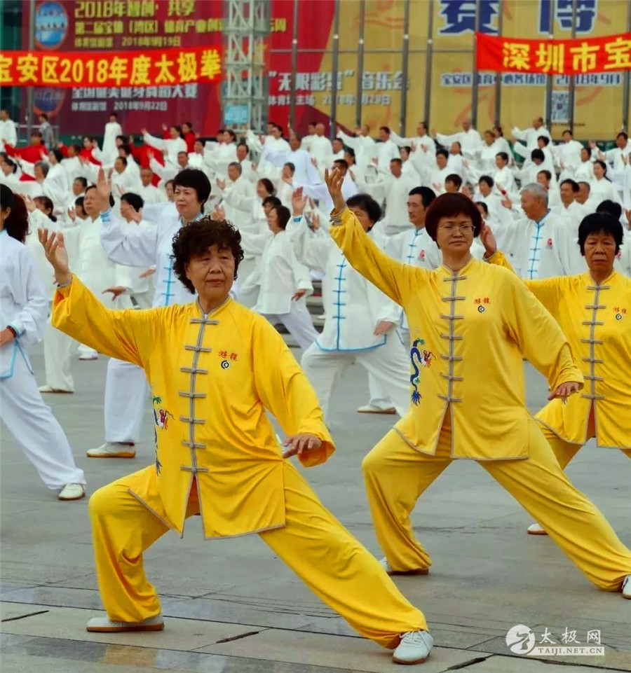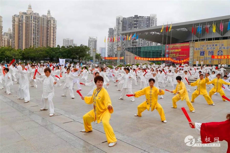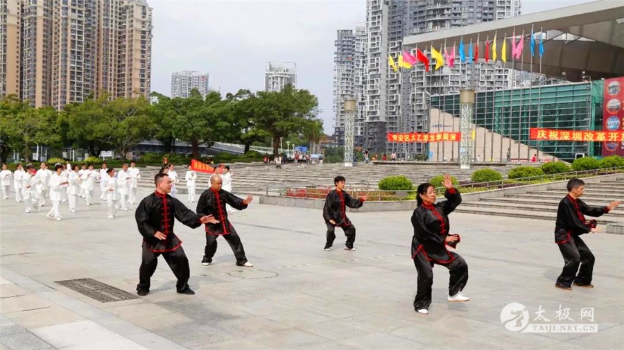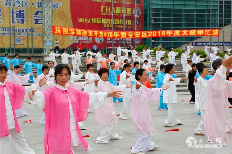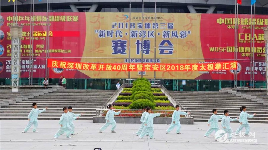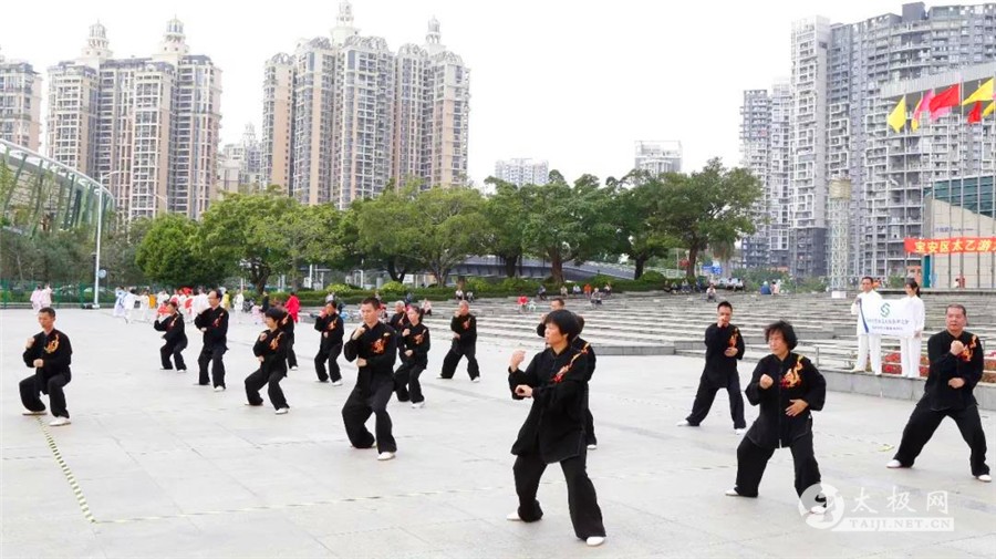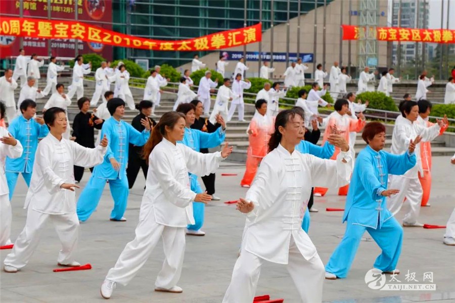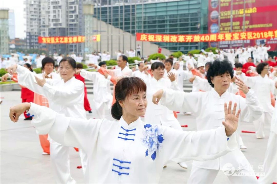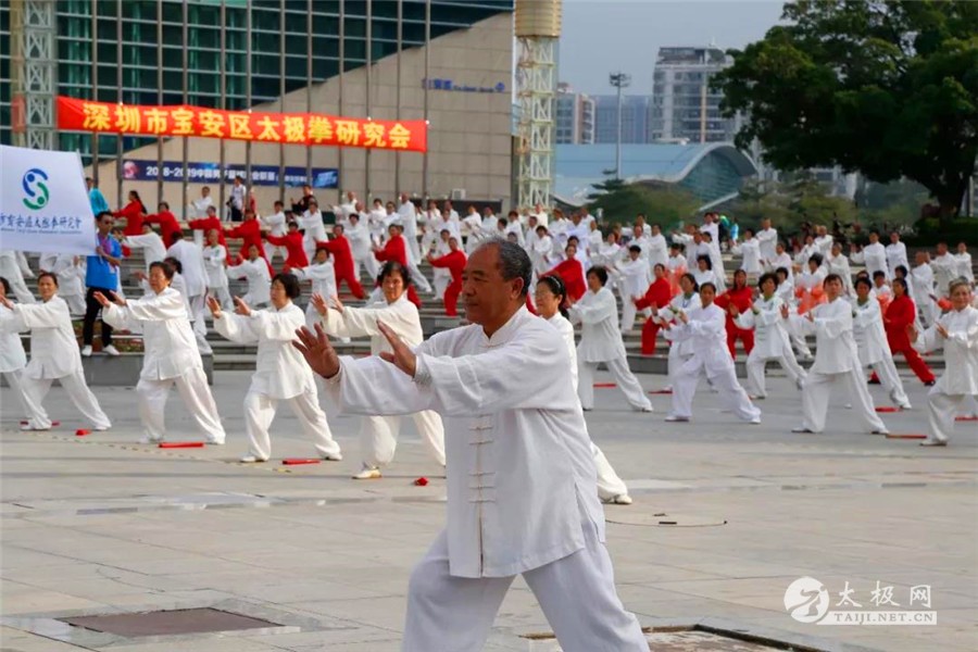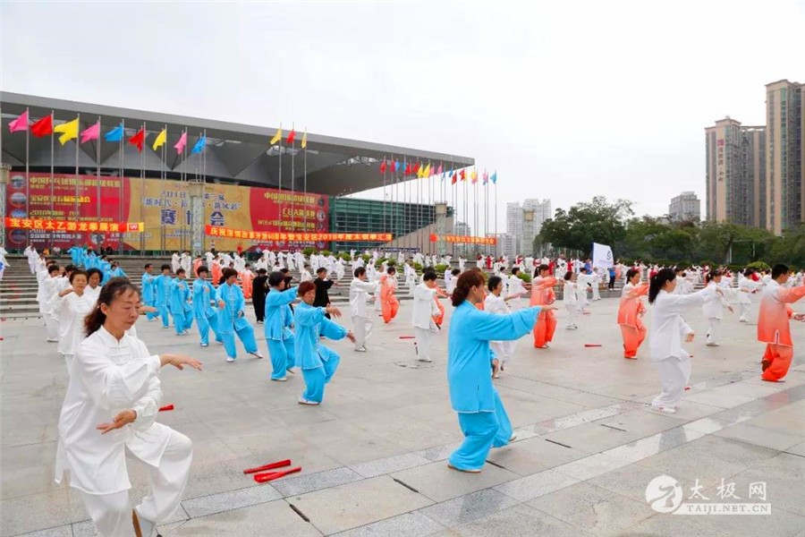 为庆祝深圳改革开放40周年暨深圳市宝安区太极拳研究会成立一周年,宝安区太极拳研究会于2018年11月10日在宝安体育馆南门广场举行了隆重的太极拳汇演活动。此次汇演共有28支队伍700余人参加,其中宝安区22个辅导站,福田、罗湖、龙华、南山、龙岗等区的6支队伍应邀参加表演。精彩的拳艺汇演传承了太极文化的精髓,展现了新时代太极人的风采。 出席此次活动的嘉宾有: 宝安区文体旅游局副局长卢清 宝安区文体旅游局体育科科长刘永祥 宝安区老龄办陈冰 深圳市太极拳研究会党支部书记、副会长杨广德 深圳市太极拳研究会副会长、深圳市社会体育指导员协会会长助理刘筠 中国武术七段、大宋体育产业股份有限公司董事局主席、杨氏太极第五代传人、宝安区太极拳研究会技术总顾问宋斌 天年之家柏慧 中国武术六段、中国武术段位制考评员、指导员、宝安区太乙游龙拳主要传播者江慧莲 杨氏太极拳103式深圳主要传播者魏国梁、石秋莲、肖佑光 中国武术六段、国家一级社会体育指导员、中国武术段位指导员、考评员、中国武术二级裁判员魏兆兰 中国武术六段、深圳市龙华区福城湘燕太极拳协会会长刘彩艳 武当赵堡太极拳第十四代传人、罗湖区品之唐太极拳协会会长唐仲春 陈家沟太极拳第十三代传人、深圳市太极拳研究会常务理事兼坂田太极辅导站站长龙秀文 中国武术六段、陈氏太极拳第十二代传人付碧云 陈式小架太极拳第11代传人贾洪新 宝安区太极拳研究会会长谢勤先生致欢迎辞,表示将继续开展各项培训和活动,不断提高会员的技术水平,让每一位参与者都享受太极拳带来的快乐与健康。