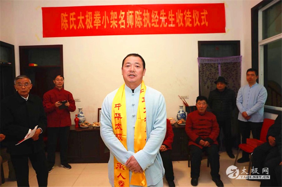 陈一华主持 收徒仪式陈家沟陈氏家族理事会理事长陈一华由主持。仪式遵循传统、简洁庄重,陈执经老师首先向太极拳历代宗师上香、敬酒并行叩拜礼,在众嘉宾的见证下,新弟子按照传统的拜师礼仪,宣读拜师帖、递交拜师帖并一一行拜师礼 。
