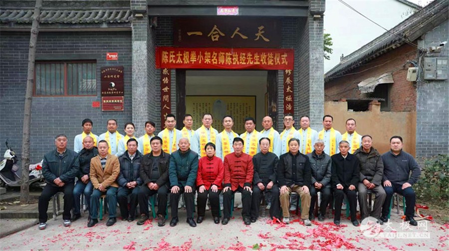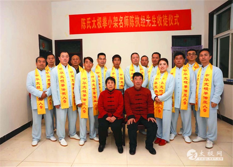 师徒合影 陈执经老师向参加今天收徒仪式的嘉宾表示感谢,并表示今后将会一如既往地致力于陈氏太极拳小架的推广和传播,培养出更多更好的太极拳传承人,为推动太极拳事业发展和弘扬太极文化做出更多更好的贡献。