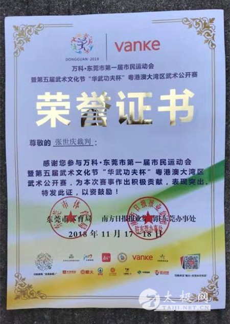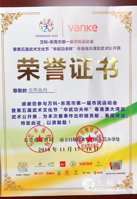裁判组 11月18日上午,万科 · 东莞市第一届市民运动会暨第五届武术文化节“华武功夫杯”粤港澳大湾区武术公开赛在东莞市体育中心体育馆拉开帷幕,来自粤港澳地区的2000 余名选手齐聚东莞,以武会友。太极名家张辉老师受邀参加本次大赛裁判工作,并带队参加比赛。 参赛代表队 东莞的武术文化源远流长,有广泛的民间基础。据不完全统计,目前东莞有各种类型的武馆约两百多家,民间习武风气日盛。东莞市武术协会已经成功举办四届的武术文化节,粤港澳大湾区武术公开赛是东莞开展时间较长,群众基础较好,极受欢迎和关注也是极具人气和影响力的市民运动项目之一。 万科 · 东莞市第一届市民运动会暨第五届武术文化节 “华武功夫杯”粤港澳大湾区武术公开赛不仅是东莞武术界的嘉年华,更是粤港澳武林同道相互切磋技艺、交流情感的纽带。为保证大赛的公平和精彩程度,大赛组委会邀请了张辉、张世庆、严亮军、郑达俊、张峰、范世武等人组成了大赛裁判组,为比赛保驾护航。 嘉宾席 赛场的精彩纷呈,现场掌声不断,场上裁判同样认真执裁,保证比赛的公平。精彩的比赛和判罚赢得了观众和嘉宾的高度认可和赞誉。东莞长安鸿信太极馆派出了三支代表队参赛,分别参加了长青组、成人组和少儿组项目。经过激烈角逐,谭再瑜获常青组拳、剑两项第一名,董留刚成人组拳、短器械两项第一,唐湘生单刀第一名,杨燕朝青年组太极拳第二、长器械第一,王艺霖获高中组拳、单刀两项第一。集体项目获得了成人组单刀金牌,长安第一小学少儿组二路炮锤金牌等多项优异成绩。张辉、严亮军、唐湘生获优秀领队,张辉、米红刚、董留刚分别获优秀教练员。 荣誉证书 奖杯奖牌 合影 张辉老师表示,担任裁判倍感荣幸的同时也觉得责任重大,希望通过传统武术与运动会的结合,推动全民健身运动和武术运动的蓬勃开展,期待更多人关注并支持武术运动,在赛场上切磋技艺、挑战自我、展示风采。 东莞市武术协会主席张伟权说,希望借力东莞市民运动会,将全民健身的理念传递到整个粤港澳大湾区,也传递到东莞每一个社区、每一位市民,使武术运动成为更多市民的生活方式,成为东莞这座城市永不落幕的亮丽风景。欢迎参赛选手的家人和朋友们一同走进赛场,加油鼓劲,一起感受武术的魅力,一起在武术运动中分享亲情和友谊。 本站责编:张欢 |
