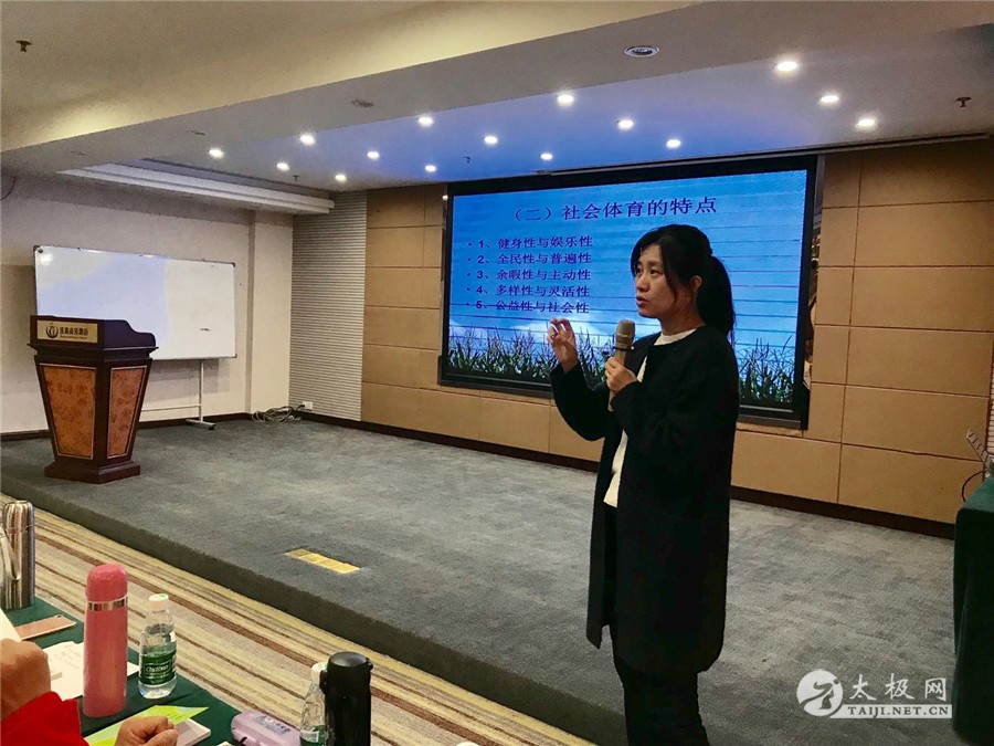 (太极网报道)12月29日至30日,广东省一级社会体育指导员培训班于广州佛山隆重举行。东莞市选派了梁华国、李碧海、范世武、张之辉等9人参加本次培训。 社会体育是我国体育事业的重要组成部分,是广大社区群众社会文化生活的重要内容,随着人们生活水平的提升和生活方式的变化,追求高质量的体育文化娱乐生活,成为对社会体育的必然诉求。为不断提高社会体育工作计划宏伟目标,加强社会体育管理,制定科学实效的社会体育计划,为实现我国体育事业的总目标奠定坚实基础,是社会体育工作者必须努力的目标和方向。 培训会议于29日上午9时正式开始,广东省社会体育指导员协会秘书长陈明主持会议,雷桂成教授和王菁教授分别讲解了运动损伤与运动康复和社会体育指导员概论,以及理论考核,下午进行太极拳技术部门培训。据了解,30日早上9至11:30技术培训和技术考核。 王菁教授讲解社会体育指导员概论 |