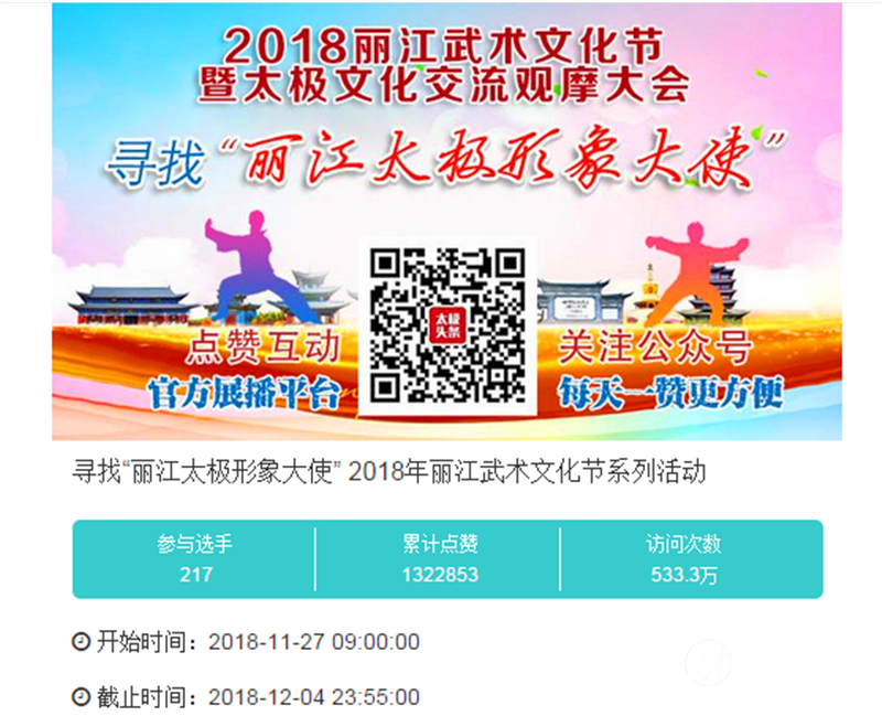 七彩云南大美丽江,武术为媒聚五湖四海,扬中华国粹!人间仙境泸沽湖畔,因网结缘会天下拳友,享天人合一! 由中共丽江市委宣传部支持,丽江市体育局、太极网、文宇文化传媒(北京)有限公司主办,丽江国际武术文化节组委会、丽江石莲文化传播有限公司、丽江意和文化传播有限公司等承办的2018年丽江武术文化节暨太极文化交流观摩大会成功举行,来自全国各自的45支代表队近五百名太极拳爱好者共襄盛会,高峰论坛、各流派太极拳名家表演、太极武术大赛、泸沽湖旅游等系列活动圆满举行,全体成员于丽江和泸沽湖的大美山水之间纵享太极,展现天人合一的壮美画面。 为充分契合和倡导“太极+赛事+旅游”的活动主题,线上线下结合宣传推介丽江文化旅游,传播太极正能量,向世界展示参会太极人的英姿,丽江国际武术文化节组委会、太极网发起“寻找丽江太极形象大使”的网络展播活动。 展播宣传活动顺应“互联网+太极拳”传播新潮流,活动不拘泥传统,不设门槛,不限太极拳流派,广大参会拳友、拳师、名师名家等同台亮相,通过网络公开展示丽江古城、玉龙雪山、泸沽湖畔等山水背景下的太极人形象,经全球广大太极拳爱好者点赞投票、互动留言、分享传播,根据最终展播人气结合组委会评审,评选和表彰一批“丽江太极形象大使”,组委会将为入围拳师颁发荣誉证书和水晶杯,进一步扩大和提升丽江旅游与太极文化的融合宣传。让我们再次为他们点赞! 展播平台一经推出,首日访问量即突破百万,广大拳友于平台频频留言互动,交流探讨,瞬间引爆广大太极人的朋友圈!经过七天的全球展播、点赞、互动,平台累计访问次数530多万,累计点赞132万,精选留言达4000余条······寒冬时节,太极热席卷各地!广大太极人通过展播互动交流、交心、交朋友! 现将入围名单公布如下(排名不分前后): 薛文宇 薛文宇,男,生于1977年。哈尔滨师范大学毕业,体育教育专业,本科学历,有正规的学校从教经历与经验。是文宇文化传媒(北京)有限公司CEO,国家级非物质文化遗产——李氏太极拳第五代传承人之一。 周维林 周维林,1967年生,丽江太极拳名师,杨氏太极拳第七代传人。丽江市德明太极拳体用研修会重要发起人、教练及第一任会长,是丽江太极运动的先驱者和重要推广者。 易术林 易术林,现任重庆西部海龙陈氏太极拳教练,2017年创办正德陈氏太极养身堂。师承陈小旺大师,其承诺一生致力于推广和传播太极正能量,传承至今,已改变了几百人对太极拳的重新认识,让百余人坚持下来的学员身体发生了明显变化。 张东武 张东武,生于1970年,河南省温县杨磊村人。中国武术七段、国家一级拳师、陈氏太极拳高级教练、国际太极拳年会"太极十杰"之一、国际太极拳文化传播大使、中华太极拳杰出传承人、非物质文化遗产陈氏太极拳传承人。中国陈家沟陈氏十九世、太极拳第十一代嫡宗传人陈正雷大师的入室弟子、陈氏太极拳第十二代传人。现任河南东武太极文化传播有限公司董事长、郑州东武太极研修院院长、法国张东武太极学院首席总监、香港陈式太极拳总会副主席、河南陈氏太极拳协会副秘书长、焦作市陈式太极拳协会副会长、中国武术段位指导员、考评员。 和有禄 和有禄,1963年生于河南省温县赵堡镇一个太极拳世家。自幼随父习祖传拳法,是和式太极拳第六代嫡系传人。温县和式太极拳学院院长、国家级非物质文化遗产和式太极拳代表性传承人,河南大学体育学院、河南理工大学体育学院客座教授。 陈西立 陈西立,陕西西安人,祖籍河南温县陈家沟。陈家沟陈氏第二十世、陈氏太极拳第十二代传人,师承其父陈全忠。国家武术一级裁判、国家一级健身指导员、太极文化传播大使、太极网首席武术导师、《大拳师·百家讲堂》首位主讲人。现任陕西省武术协会太极拳专家委员会副主任、西安市武术协会副主席、西安陈式太极拳推广中心主任、延安市太极拳协会名誉主席、西安陈全忠太极拳学校校长兼总教练。近年来领导陈全忠太极拳体系,以陈全忠太极拳学校为基地,传播推广太极拳,在国内外武术界享有盛誉。 吴月霞 吴月霞,杨氏太极拳第六代传人,现任微观公益协会理事长。杨氏太极社会指导员、二级裁判员、中国武术协会会员。 杨丽媛 杨丽媛,女,云南师范大学毕业,大专学历。陈照森大师入室弟子,陈氏太极拳第十二代传承人。1979年跟随史氏八卦掌第三代传承人陈中燕老师学习八卦掌、太极拳、青年拳、达摩剑等。国际太极拳高级教练、中国武术六段、国家社会体育指导员、中国段位制指导员、考评员。 刘建辉 刘建辉,河北藁城人,太极拳大师马虹先生入室弟子,陈氏太极拳第十二代传人。中国武术六段,国家武术段位制指导员、考评员。现任石家庄武术协会陈氏太极拳专业委员会副会长、藁城区武术协会会长、石家庄建辉陈氏太极拳学校校长,石家庄太极禅林缔造者。 叶建国 叶建国,1955年生,从小热爱武术,2O16年拜太极名家苏德发为师,成为陈氏太极拳第十二传人。现任湖北大冶市太极拳协会会长,大冶市众妙太极拳馆馆长,太极网大冶分站站长。 李会斌 李会斌,河北藁城人,自幼习武,曾练习散打,武术器械等,2013拜入刘建辉老师门下,成为陈氏太极拳十三代传人。现长期从事传统陈氏太极拳教学工作,担任石家庄市藁城区武术协会副会长