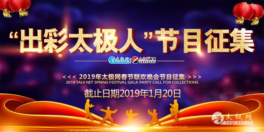 瑞狗辞旧岁,金猪送春来。值此辞旧迎新之际,太极网全体工作人员祝广大太极拳爱好者新春快乐,万事如意,来年更上一层楼! 悉闻各地太极拳组织及拳馆为庆贺新春佳节纷纷举办年会活动,活动精彩纷呈,充分展现了太极拳的魅力和太极人的英姿。太极网全媒体团队为此精心筹备了“出彩太极人”太极春晚活动,旨在分享传播太极正能量,提升太极拳影响力,进一步加强太极拳宣传力度,让更多的人看到太极人的飒爽英姿!即日起在全国范围内开展节目征集活动,遴选一批优秀文艺节目登上太极春晚舞台。现将春晚节目征集有关事项通知如下: 一、活动主题 太极有我更出彩 二、征集内容 1、各太极拳协会、太极拳馆校等太极拳相关组织的年会优秀节目视频(单个完整节目)以及年会精彩内容。 2、2019拜年视频:2019年太极人拜年视频征集(视频稳定清晰,时长20秒左右),拜年内容样本(不限于):我是XXX,我代表XX(拳馆/组织)祝广大太极拳爱好者新年快乐,万事如意! 三、征集范围 各太极拳协会、太极拳馆校等太极拳相关组织,凡愿意参与太极春晚创作演出的集体或个人均可免费报名参加遴选。 四、征集时间 2018年12月20日至2019年1月20日 五、播出时间 2019年2月2日(腊月二十八)晚上八点于太极网“大拳师直播间”全球同步直播。 2019年2月5日(正月初一)至2019年2月12日(正月初七)节目展播。 六、节目类型 主要是太极拳个人、集体表演以及歌曲、舞蹈、杂技、魔术、小品、相声、器乐演奏、绝技绝活、创意表演等,以及其他适合舞台表演和电视呈现的艺术形式。 七、视频要求 1、 视频要求清晰流畅,图像稳定,画面赏心悦目(建议拍摄使用三脚架)。凡有悖社会公德、含有违反相关法律规定的图像、图片、文字、声音的将被取消资格。 2、画面禁止包含他人权利的商标标识、商业招牌、广告植入等商业行为(风景名胜区、文化场馆等公益性场所以及太极拳馆等内容除外)。 3、版权、肖像权自负,主办方不承担因参与作品导致的包括但不限于肖像权、名誉权、隐私权、著作权、商标权等纠纷而产生的法律责任。 八、提交方式 1、报名表(需完整填写)与视频文件一并发送至大赛组委会,二者缺一不可。视频文件和报名表名称一致,格式为:姓名+组织+作品名称。 2、参与作品可以直接以邮箱、QQ等形式发送。 A、接收视频邮箱: 811178358@qq.com B、QQ传送:811178358 3、为保证视频文件的完整性,视频能够正常播放,以收到组委会正式回复为提交完成。 4、各太极拳协会、太极拳馆校限报2个节目。 5、咨询电话: 田 丽:17703916070(微信同号) 李 宁:17796685993(微信同号) 杨 超:15239150487(微信同号) 邓豪杰:18137133256(微信同号) 九、宣传途径 针对各大有影响力组织的太极拳年会活动,影响力较大的,太极网、大拳师官网、太极拳微信公众平台及太极网全媒体平台将进行公益宣传推广。 组委会将搭建网络展播平台,参与节目皆将通过展播和点赞引爆广大太极人的朋友圈,根据最终展播人气,评选和表彰一批“出彩太极人”,颁发荣誉证书和奖杯。 十、报名表格 太极网 “2019春晚出彩太极人”评选活动组委会 2018年12月16日 |