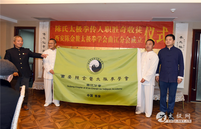 新入门弟子和师父合影 (太极网报道)2019年元月六日,陈氏太极拳小架传人职胜奇收徒仪式暨西安陈金鳌太极拳学会曲江分会成立仪式于西安金海岸大酒店隆重举行,14名太极爱好者正式拜入职胜奇老师门下,承担起传承、弘扬太极拳的责任。 参与本次活动的嘉宾有: 西安陈金鳌太极拳学会名誉会长及小架太极拳老一辈的代表李树发、王成新 西安市武术协会副主席、西安陈氏太极拳传承人联合会会长、西安陈金鳌太极拳学会会长刘永强 西安市武术协会副主席、莲湖区武术协会主席高建武 铜川市武术协会主席、陈小旺大师入室弟子王建民 西安融承太极馆馆长、王西安拳法总会西安分会会长余郅成 世界陈小旺拳总会西安分会会长、西安弘易太极拳馆长职永成 西安陈金鳌太极拳学会常务副会长张勇刚、赵雁军 西安慧缘太极养生学会会长雒春慧等 同时作为见证,还有西安陈金鳌太极拳学会的彭龙贵、郭安祥、闫华、李昕卓、王兆宗、李卓、赵刚、王君安、刘根福以及富平分会的汪贤斌汪会长等诸多同门师兄弟参与了本次活动。 职胜奇是陈氏太极拳小架第11代传人。自幼随父职汝垒学拳,坚持40余载而不辍。其父师从陈金鳌,鳌老乃一代宗师陈垚、陈鑫之嫡孙。职胜奇家学深厚,拳艺精湛,为人谦和真诚,见识广博,此次开山收徒,实乃西安拳界之幸事。 拜师仪式遵循传统,简洁庄重。师父带领弟子们祭拜了先祖,告慰祖师收徒授艺,香火有继,传承有序。众弟子表示今后定当谨遵师训,恪守门规,勤勉参悟,刻苦研练,为太极拳的发展和传承贡献自己的一份力量。到场众人共同见证了这一美好而又庄严的时刻。 刘永强会长颁发分会牌匾 曲江分会骨干成员 在接下来的议程中,西安陈氏太极拳传承人联合会会长、西安陈金鳌太极拳学会会长刘永强代表学会作了讲话,并颁发了曲江分会牌匾和会旗。职胜奇作为曲江分会会长,向来宾宣读了分会宗旨,并介绍了分会成员。 富平分会汪贤斌会长祝贺曲江分会成立赠旗 曲江分会的成立,是曲江新区的福音,使曲江的人们能够共享中华太极发展的文明成果。分会将以此为平台,吸引更多的陈氏太极拳小架爱好者参与,对进一步扩大西安陈金鳌太极拳学会规模,推进太极发展,促进人民身体健康,起到积极的推动作用。 本站责编:太极网萌 |