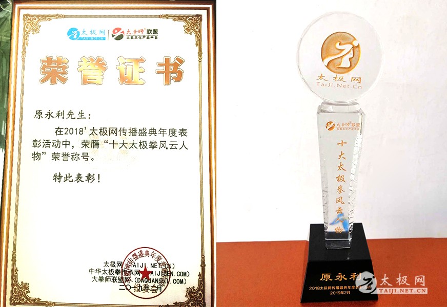 太极网(taiji.net.cn)是创立于1997年的专业太极网站,领衔太极文化传播与推广20余载。为积极挖掘、表彰、鼓励在2018年度太极拳传播推广领域表现突出的传承人、拳师,太极网·大拳师联盟发起举办“2018太极网传播盛典年度表彰活动”,充分结合当前“互联网+太极拳”传播新形势,与广大拳友共同见证太极拳传播的勃勃生机! 荣誉证书 本次表彰活动充分利用互联网传播,广知拳界,广大太极拳传承人、拳师公平竞争。开通线上自主申报或推荐,由主办方进行资料初审筛选,活动组委会根据初审结果二次审核把关,综合考量拳师武德拳技、2018活动成绩、推广贡献等最终择优通过,保证活动的权威性和严谨性。 原永利先生一九七六年出生于著名的太极拳发源地--河南温县,现在为赵堡太极拳第十一传人、陈家沟陈式太极拳第十二代传人、忽灵劲太极拳第五代传人,现任温县原占国太极拳功夫馆馆长、厦门中原太极拳社馆长、中国武术段位六段、陈家沟功夫学校技术顾问。 原永利 原永利先生从六岁起跟其父原占国太极大师习练祖传赵堡太极拳、陈式太极拳、腾挪忽灵劲太极拳、刀、枪、剑、棍等器械;太极五种推手法、祖传飞镖、太极散手和太极理论,尽得其父真传,又经陈式太极拳大师陈照森师叔指点。
