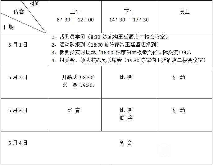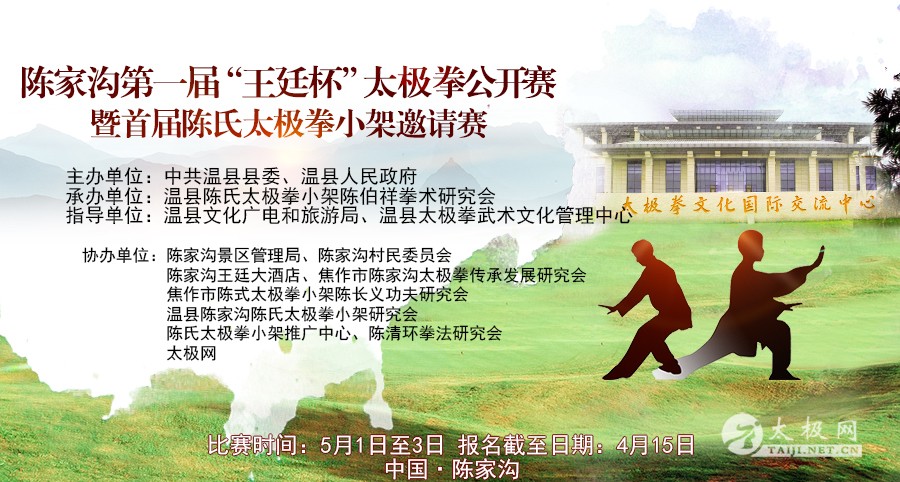 陈家沟第一届“王廷杯”太极拳公开赛 暨首届陈氏太极拳小架邀请赛竞赛规程 一、比赛时间及地点 2019年5月1日至5月3日在陈家沟太极拳文化国际交流中心举办 二、主办单位 中共温县县委 温县人民政府 三、承办单位 温县陈氏太极拳小架陈伯祥拳术研究会 四、指导单位 温县文化广电和旅游局 温县太极拳武术文化管理中心 五、协办单位 温县陈家沟景区管理局 陈家沟村民委员会 陈家沟王廷大酒店 焦作市陈家沟太极拳传承发展研究会 焦作市陈式太极拳小架陈长义功夫研究会 温县陈家沟陈氏太极拳小架研究会 陈氏太极拳小架推广中心 陈清环拳法研究会 太极网 六、参赛单位 国内外各省辖市、直管县武术协会、武术社团、武术馆校及各地陈氏太极拳小架习练者 七、竞赛项目 (一)陈氏太极拳小架一、二、三层架,炮锤 (二)各类器械(单刀、单剑、双刀、双剑、春秋大刀、二十四花枪、十三大杆) (三)集体项目(含集体拳术、器械,报名时须填写具体名称) 八、参赛分组 (一)各参赛单位可派领队1人、教练员1人,运动员总数不限,男女不限 (二)每名运动员限报2个单项(套路、器械各一项),同一组别报名不足6人者,合并到相邻的组别,男女可混编 (三)个人竞赛项目年龄分组 A组:儿童组 12周岁(含)以下(2006年12月31日之后出生者) B组:少年组 12周岁至17周岁(2007年12月31日至2002年1月1日) C组:成年组 18—39周岁(2001年12月31日—1980年1月1日出生者) D组:中年组 40—59周岁(1979年12月31日—1960年1月1日出生者) E 组:老年组 60周岁(含)以上(1959年12月31日之前出生者) 注:报名不足6人的组别,并入上一组比赛 九、竞赛办法 (一)、本次比赛,采用中国武术协会印制的最新2012年《传统武术套路竞赛规则》,裁判组及仲裁组由武管中心指派 (二)、本次比赛为个人项目赛和集体项目赛 (三)、项目比赛时间: 1、陈氏太极拳小架一层架完成套路不超过5分钟,演练至4分钟时,裁判长鸣哨提示(鸣哨以后动作未完成,不予扣分); 2、陈氏太极拳小架二层架完成套路不超过4分钟,演练至3分钟时,裁判长鸣哨提示; 3、陈氏太极拳小架三层架及炮锤完成套路不超过3分钟,演练至2分钟时,裁判长鸣哨提示; 4、陈氏太极拳小架器械类:太极单剑完成套路时间不超过3分钟。演练至2分钟时,裁判长鸣哨提示。其他器械不少于1分钟; 5、集体项目不超过4分钟,人数不少于6人,性别、年龄组别不限,不足6人,每少1人由裁判长扣0.5分,音乐须自备(自备U盘),音乐伴奏中不得出现说唱内容,若出现说唱裁判长总扣0.1分,未配乐者裁判长扣0.1分。比赛时,由本队教练或领队负责放音乐。 (四)、运动员的参赛服装要体现出项目特色、民族特色和时代特色,不得着便装参赛,否则不予评分 十、录取名次和奖励 (一)集体、各单项和各组别男、女分别设一等奖(按20%比例录取)、二等奖(按30%比例录取)、三等奖(按40%比例录取)颁发获奖证书 (二)录取比例均按照实际参赛人数,采取四舍五入的办法 (三)设立运动员、运动队“武德风尚奖”及“优秀组织奖” 十一、日程安排 十二、报名与报到 (一)报名 1.请各参赛队2019年4月15日前务必将报名报项表用A4纸打印一式两份,一份邮寄(以到达邮戳为准)至大赛组委会,一份留存本队备份,便于核对。并将电子版发送至电子邮箱:wxcbxqsyjh@163.com 邮寄地址: 河南省焦作市温县赵堡镇陈家沟安顺巷陈诗雨收 联系电话:13782878504 2.邮寄报名材料时,请将运动员本人一寸免冠照片一张,身份证复印件,责任声明书,人身意外保险单,健康证明及汇款凭证复印件一并邮寄至大赛组委会 (二)报到 1.裁判员于5月1日早8点30分前到陈家沟王廷酒店报到 2.请各参赛队于5月1日到陈家沟王廷酒店报到 组委会:陈绍冲 15139129005 陈绍杰 13839112679 李丰桥 15939161112 大会保障组组长:陈绍冲 3.请各参赛队于4月15日前务必将报名表邮寄至组委会 十三、收费 (一)本次赛会本着“以赛养赛”的原则,收取参赛费每人200元 (二)各队交通费、食宿费自理;需大会介绍安排酒店住宿的各参赛队和个人需提前与大赛保障组联系安排 (三) 所有费用可与大赛组委会联系,通过微信或汇款交清 十四、仲裁委员会和裁判员 (一) 仲裁委员会人员组成和职责范围按《仲裁委员会条例》执行 (二) 裁判员由武管中心选派,另行通知 十五、报名联系方式 地址:河南省焦作市温县赵堡镇陈家沟安顺巷 邮编:454865 电话:陈诗雨13782878504(同微信) 陈明哲18336882327(同微信) 电子邮箱:wxcbxqsyjh@163.com 十六、汇款地址 邮政银行:中国邮政储蓄银行 账号:6217995010002180917 工商银行:中国工商银行 账号:6215581709001570481 户名:陈春生 1 汇款时请标注代表队名称; 2 请保留汇款凭证,并将汇款凭证复印件一张随报名表一并邮寄至组委会。 十七、交通 乘坐火车到郑州火车站、高铁站——郑州长途汽车中心站或郑州新北站——温县汽车站——陈家沟王廷酒店; 乘坐飞机到新郑机场——坐民航大巴或地铁——郑州长途汽车中心站或郑州新北站——温县汽车站——陈家沟王廷酒店; 乘坐火车到新乡火车站、高铁站——新乡汽车站——温县汽车站——陈家沟王廷酒店; 乘坐火车到洛阳火车站、高铁站——洛阳汽车站——温县汽车站——陈家沟王廷酒店; 乘坐火车到焦作火车站——焦作铜马汽车站——温县汽车站——陈家沟王廷酒店。 十八、其他 (一) 请各参赛队领队和教练,于5月1日晚19:30
